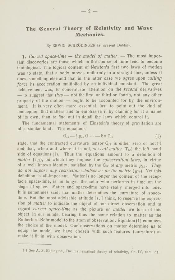 Erwin Schrödinger (1940). The General Theory of Relativity and Wave Mechanics. Wis-en natuurkundig Tijdschrift, 10: 2–9.