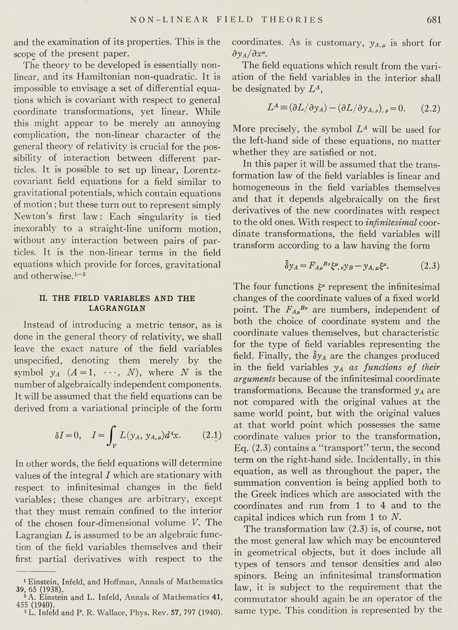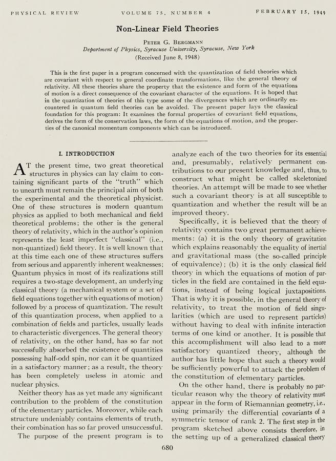 Peter G. Bergmann (1949). Non-Linear Field Theories. Physical Review, 75: 680–685.