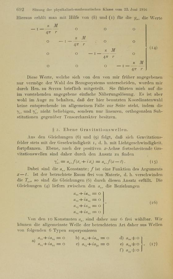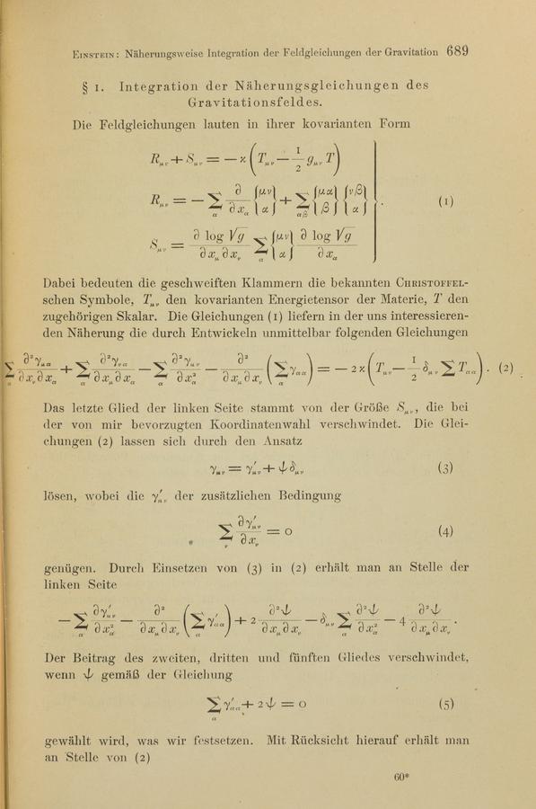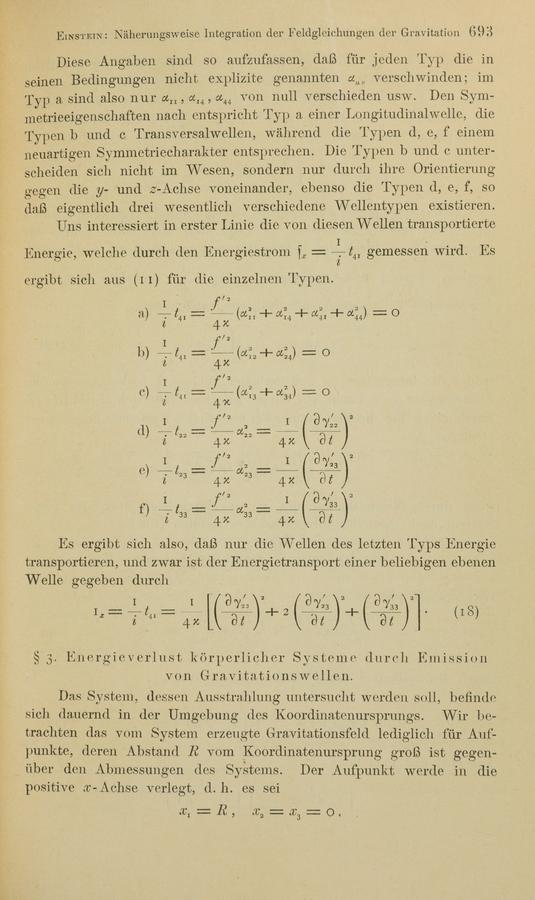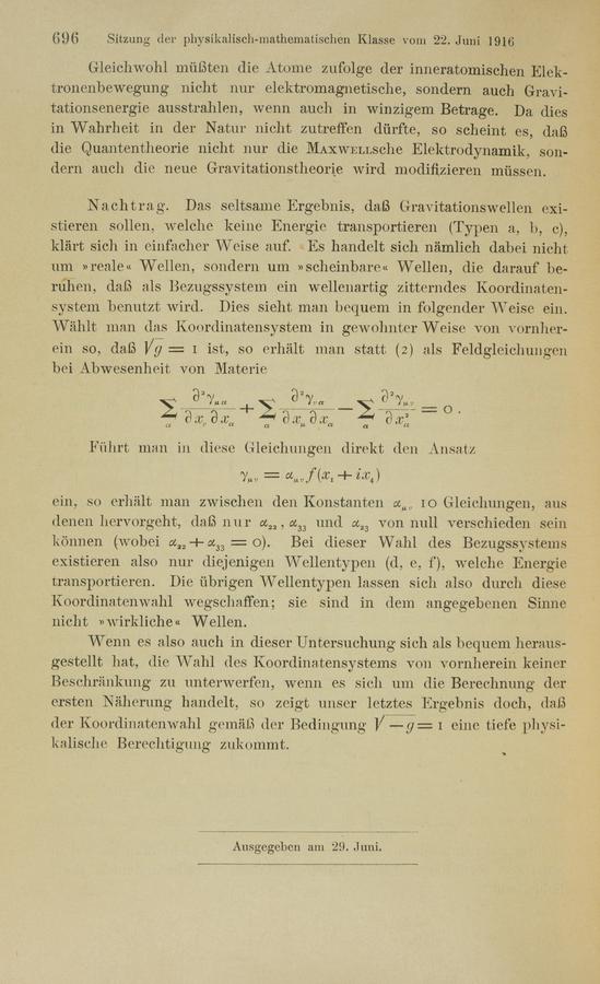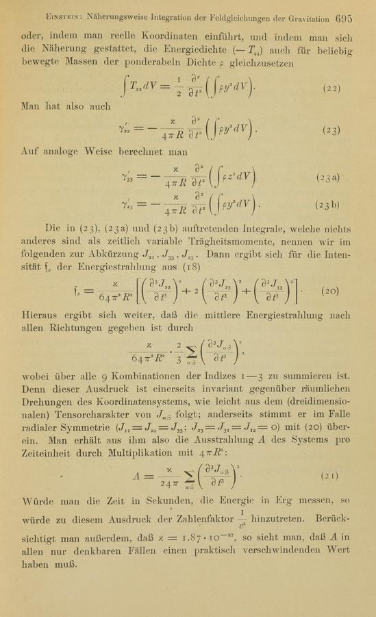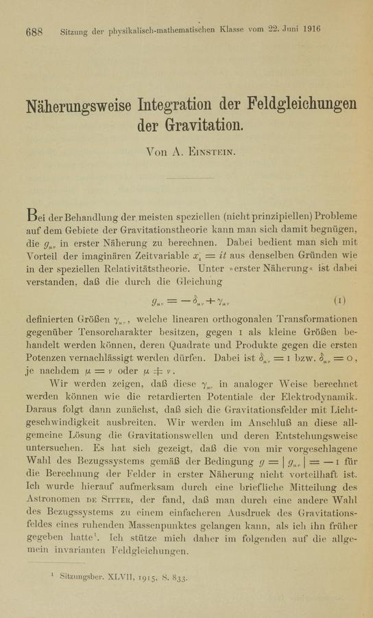 Albert Einstein (1916). Näherungsweise Integration der Feldgleichungen der Gravitation. Königlich Preußische Akademie der Wissenschaften (Berlin). Sitzungsberichte.