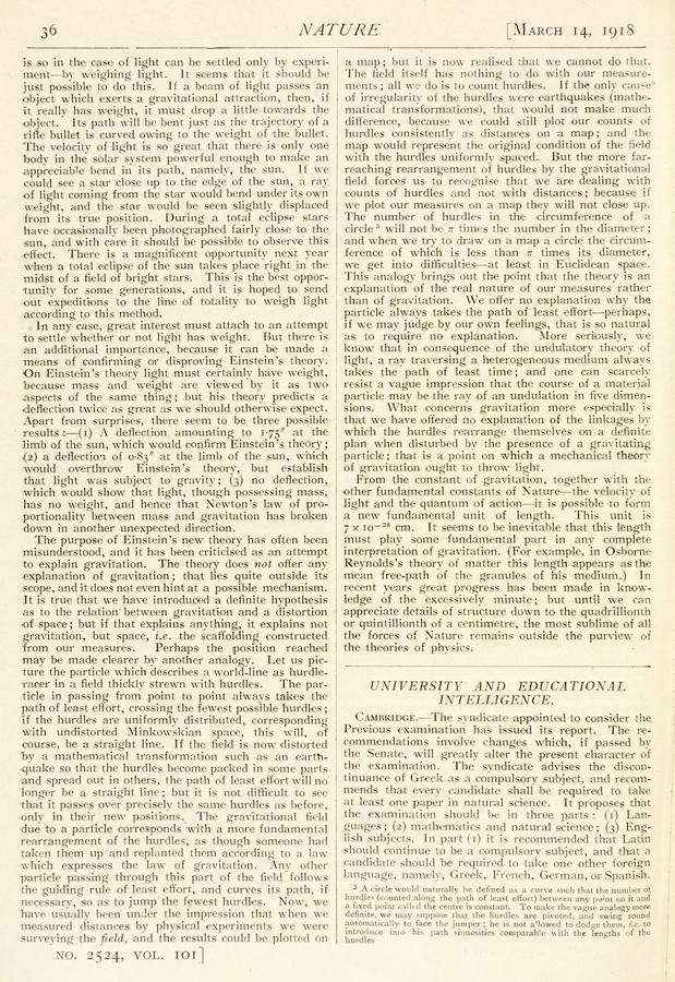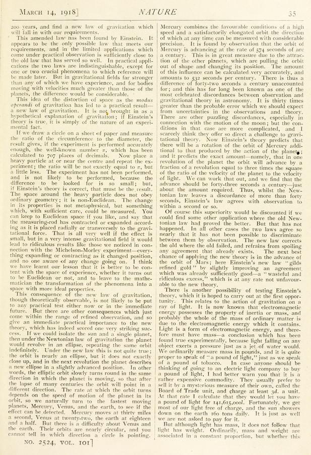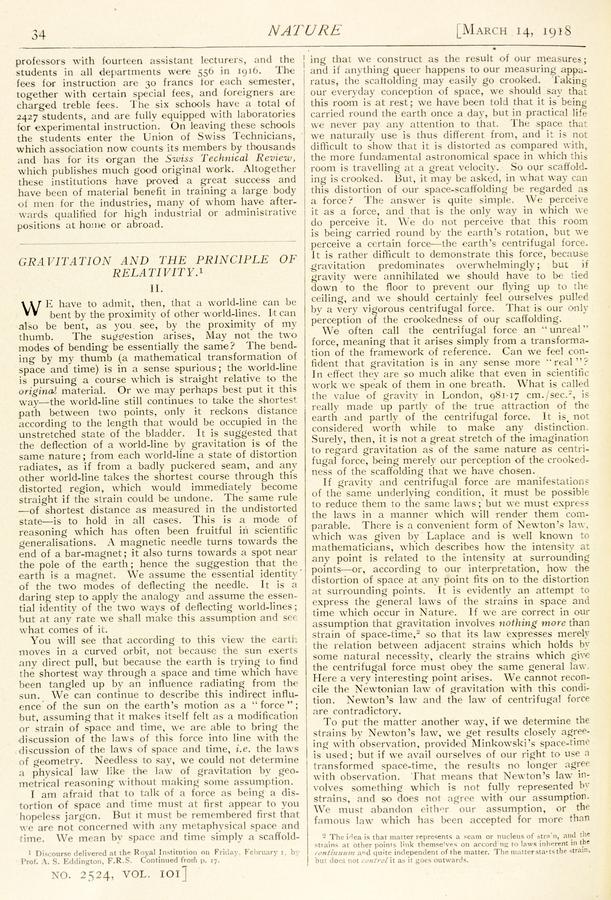 Arthur Stanley Eddington (1918). Gravitation and the Principle of Relativity II. Nature 101(2524): 34–36.