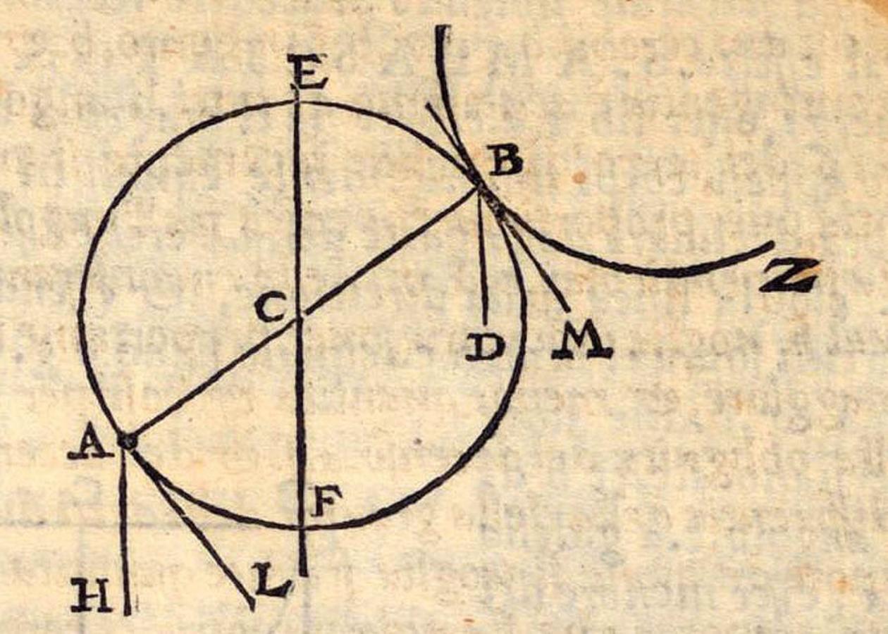 Fig. 4.4: Descartes’s visualization of the centrifugal tendency of bodies thrown by a sling, in Le Monde, Ch.7. (Bayerische Staatsbibliothek)