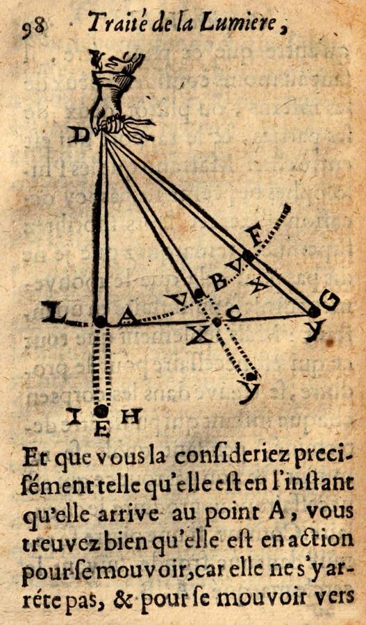 Descartes 1998, 29. Descartes 1986, 43–44: “Lors qu’un corps se meut, encore que son mouvement se fasse plus souvent en ligne courbe, et qu’il ne s’en puisse jamais faire aucun, qui ne soit en quelque façon circulaire […], toutesfois chacune de ses parties en particulier tend toujours à continuer la sien en ligne droite. Et ainsi leur action, c’est à dire l’inclination qu’elles ont à se mouvoir, est differente de leur mouvement.”