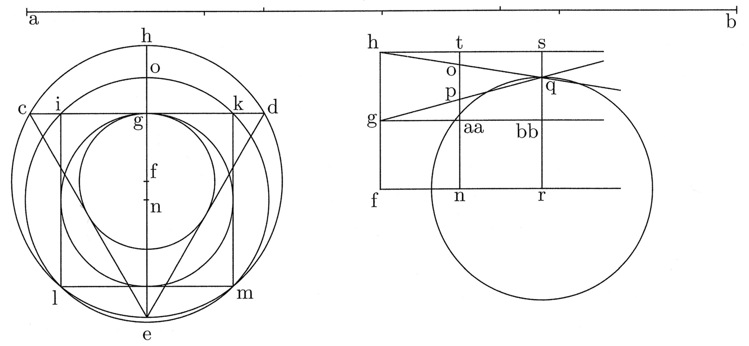 4. Faciemus autem hanc partem tibi hoc modo clariorem (cfr. figura 1). Ex ab linea in tres partes divisa cde triangulus designetur, et in eius latere cd signetur pars quarta ab, quae sit ik, quae quadretur, et sit iklm. Describantur inscripti et circumscripti circuli, et sit inscripti trigono semidiameter fg et circumscripti fh et inscripti tetragono ng, circumscripti no. Signetur deinde linea fh et in eius medio g. Lineis de f, g, h tractis quantumlibet trahatur ad fh aequedistans tn, cuius medium sit aa, et signetur semidiameter inscripti alicuius polygoniae isoperimetrae, puta tetragonae, quae sit np, et semidiameter circumscripti, quae sit no. Et trahe de g per p ‹lineam› in infinitum et similiter de h per o lineam in infinitum, et ubi illae concurrunt, signa q. Trahe per q aequedistantem ad fh, quae sit sr, in cuius medio signa bb. Dicimus rq esse semidiametrum circuli quaesiti et eius circumferentiam aequalem ab lineae rectae.