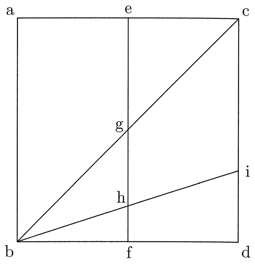 8. Adhuc aliter. Capacitas circuli super capacitatem trigoni est maxima et differentia semidiametrorum circulorum inscripti et circumscripti est nulla seu minima simpliciter, quia minor esse nequit. Sed differentia semidiametrorum circulorum inscripti et circumscripti trigono est maxima, capacitas vero eius super sui ipsius capacitatem est nulla vel minima simpliciter. Esto igitur, quod aliqua linea sit ut differentia semidiametrorum in trigono et etiam sit ut capacitas circuli super trigonum, quae sit ab linea (cfr. figura 4). Quadretur igitur illa et sit quadratum abcd, et sit ab ut differentia semidiametrorum cum illa minima capacitate trigoni super sui ipsius capacitatem, et cd capacitas circuli super trigonum cum illa minima differentia semidiametrorum talium, et trahatur linea diametralis bc. Dico in omnibus polygoniis mediis inter trigonum et circulum lineas capacitatis super capacitatem trigoni cum differentia semidiametrorum non posse esse maiores nec minores ab aut cd, ut de se patet. Esto igitur, quod trahatur ef linea aequalis et aequidistans ad ab et cd, et illa secetur per bc in puncto g, et sit ge ut differentia semidiametrorum talium in tetragono. Manifestum est, quod gf erit ut capacitas tetragoni super trigonum. Erit igitur habitudo capacitatis tetragoni super capacitatem trigoni ad capacitatem circuli super capacitatem trigoni ut gf ad cd. Signatur igitur in fg additio semidiametri inscripti tetragono super semidiametrum inscripti trigono, et sit fh et trahatur de b per h ad cd linea, et contactus sit i. Dico quod di est additio semidiametri circuli isoperimetri super semidiametrum inscripti trigono. Quae enim est habitudo fg ad dc, illa fh ad di. Sed diversitas capacitatis in isopleuris et isoperimetris super capacitatem trigoni non evenit nisi ex diversa additione semidiametrorum circulorum inscriptorum super semidiametrum inscripti trigono. Quae igitur est habitudo capacitatum super trigonum, illa est additionum semidiametrorum inscriptorum super semidiametrum circuli inscripti trigono. Per hoc patet quaesitum.