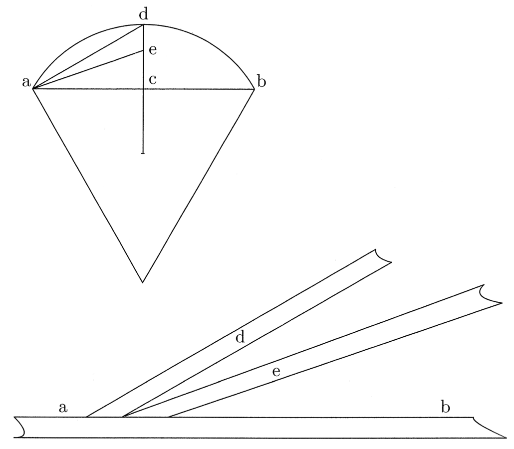 39. Adhuc ut latus cuiuscumque multiangulae quantocius vertas in curvam, facere poteris instrumentum duplicis anguli. Ut si latus sit ab trigoni, cuius sagitta seu primae et secundae linearum differentia, quod idem est, sit cd, et additio semidiametri circuli super primam trigoni sit ce. Tunc si de a per e lineam traxeris et similiter de a per d aliam, duo anguli circa a constituentur. Redige igitur bae et bad in unum aereum instrumentum, quod applica in omnibus ita, ut iam in trigono, sic quod latus ab eiusdem iaceat super latus multiangulae et latus ad contingat finem sagittae. Tunc latus ae ostendit additionem super primam illius multiangulae, ut sit semidiameter circuli isoperimetri. Descripto igitur arcu secundum hoc et tractis sectoribus de centro ad fines lateris arcus, qui cadet inter sectores, aequabitur lateri dato. Procedit veritas huius ex aequali habitudine portionis addendae super primam multiangulae, ut fiat semidiameter circuli isoperimetri, ad totam differentiae primae et secundae linearum multiangulae, quae differentia sagitta nominatur (cfr. figura 10).