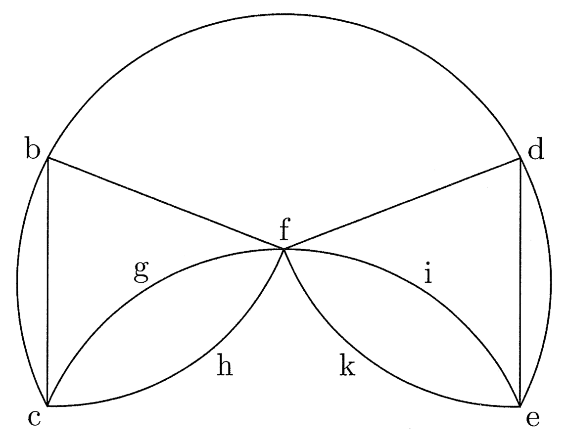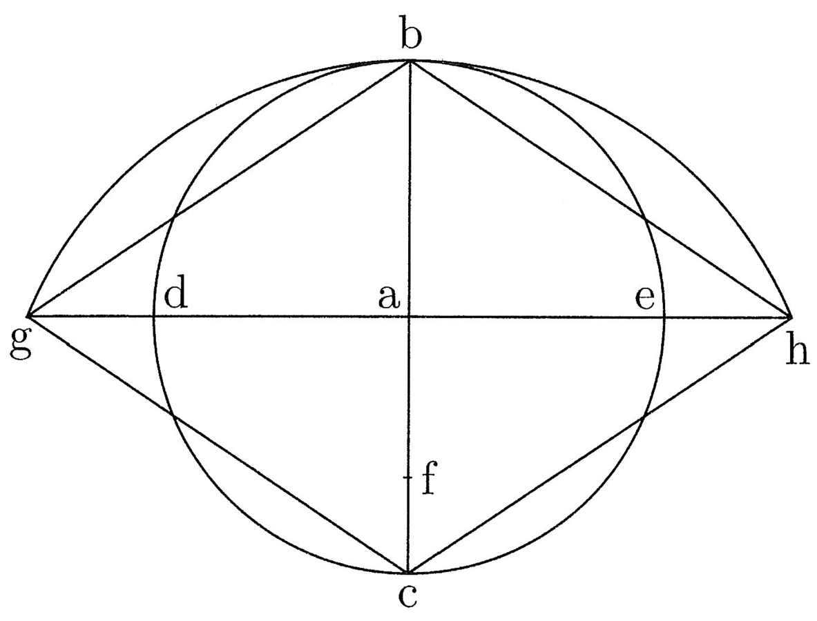 92. Descripto super a centro circulo et tracta diametro bac atque maxima chorda in infinitum extensa, quae orthogonaliter secet bac, quae sit dae, si tunc super aliquo puncto ac, qui de b distet secundum longitudinem chordae arcus tertiae partis circuli, qui sit f circulum, cuius semidiameter sit fb, descripseris, ille de maxima chorda abscindet rectam gh medietati circuli aequalem vel propinquam. Quod si de b et c rectas ad g h traxeris, erit superficies bgch aequalis vel propinqua superficiei circuli bcde (cfr. figura 39).