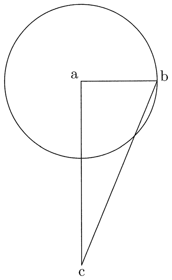 47. Ex hoc quae circa habitudines cylindrorum seu rotundarum columnalium superficierum et suarum basium et cylindralium, conicarum curvarum atque planarum circularium omnis scientia elicitur. Nam constat columnam rotundam, cuius altitudo est ut semidiameter basis, habere duplam superficiem basis. Nam linea, quae basim efficit, movetur uno puncto eius terminali stante, alio circumferentiam describente et illamet columnarem superficiem constituit per motum aequalem utriusque terminalis puncti super eadem circumferentia basis, ut ex abc angulo recto super a circumvoluto describitur basis per ab et per bc duplex superficies cylindrica, quia bc aequalis ab aequaliter in b et c punctis terminalibus movetur (cfr. figura 16).