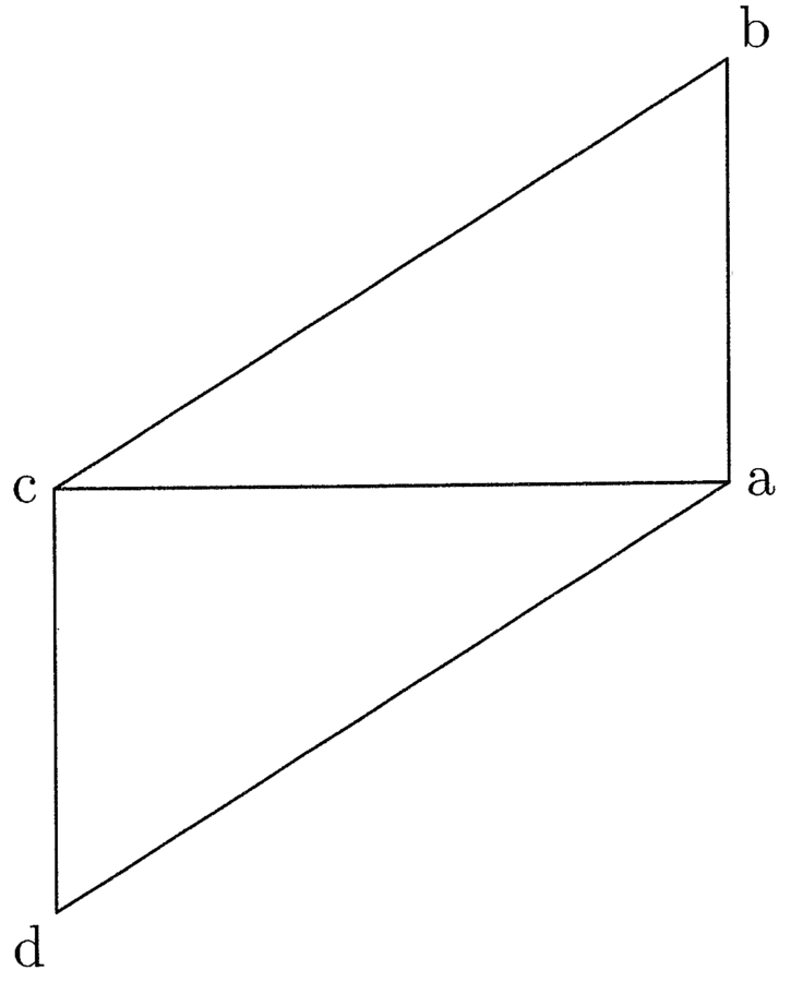 50. Adhuc est alius motus compositus, scilicet progressionis et descensionis, ut in figura. Nam, ut concipis, ab movetur duplici motu, super ac scilicet continue progrediendo et simul descendendo aequaliter (cfr. figura 18). Erit mensura progressionis ac, descensionis ab et descensionis et progressionis simul bc. In quanto enim tempore progreditur de a in c, in tanto descendit b per bc, ut veniat in c, et exoritur figura abcd. bc in se complicat duplicem motum descensionis ab et progressionis ac, quare potentia bc est ut ab et ac. Ex hoc nota, quomodo ex motu lineae simul oriuntur duo trianguli et quadrangulus.