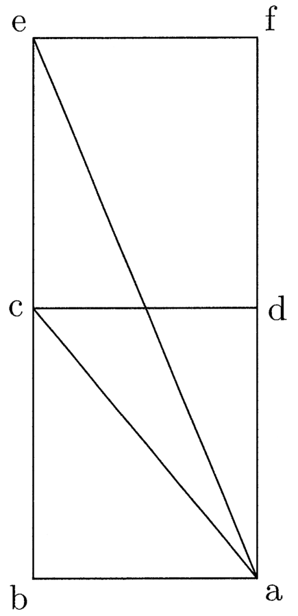 Ut si ab linea ducitur in bc, oritur figura quadrangularis abcd habens quattuor angulos rectos. Et si ab ducitur in be, quae sit dupla ad bc, oritur quadrangulus abef, qui est duplus ad abcd. Linea vero ac diameter est, similiter et ae.