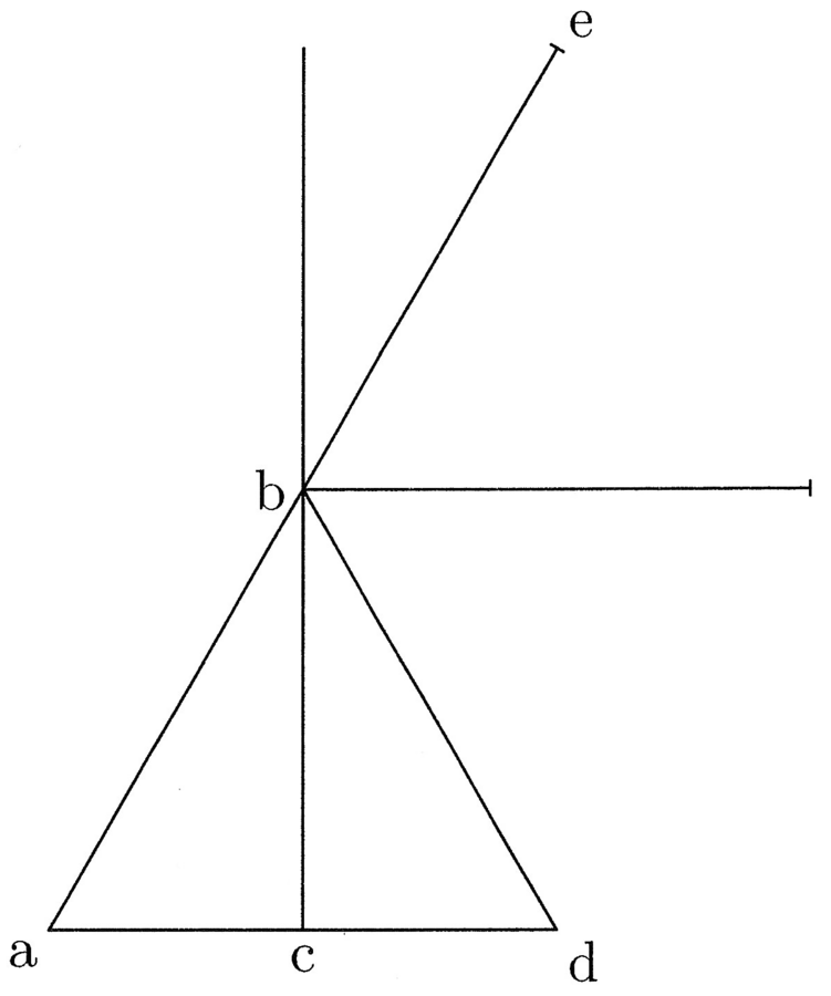 53. Est autem advertendum ex praemissis, quomodo in conicis possis procedere. Ut si abc triangulus sit et ab latus describens conicam et cb semidiameter basis, trahe lineam ac in continuum et de b duc lineam, ut facias aequalem triangu lum, qui sit bdc (cfr. figura 21). Manifestum est, si ad fixa manente circumvolvitur triangulus abd, rhombum oriri ex duobus aequalibus conis. Trahe igitur ab in continuum, et sit be ut ab. Clarum est, si circumvolvitur ut prius, lineam be efficere superficiem triplam ad superficiem ab et conicam superficiem ae quadruplam ad eam, quae ex ab. Unde si bd elevaveris in medium inter bd et be, efficiet superficiem duplam sicut bd aequalem et bc triplam, et semper pervenietur ad medium, quando faciet angulum rectum cum semidiametro basis, et si minus vel plus elevatur, minus et plus efficiet, ut haec ex praemissis nota sunt. Habes igitur, quod quando conus et columna rotunda habent eandem basem et latus coni est ut altitudo columnae, superficies columnae semper est dupla ad superficiem coni, et si plus, plus, si minus, minus proportionabiliter.