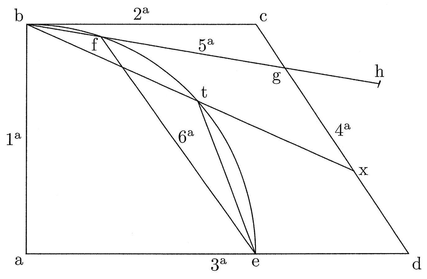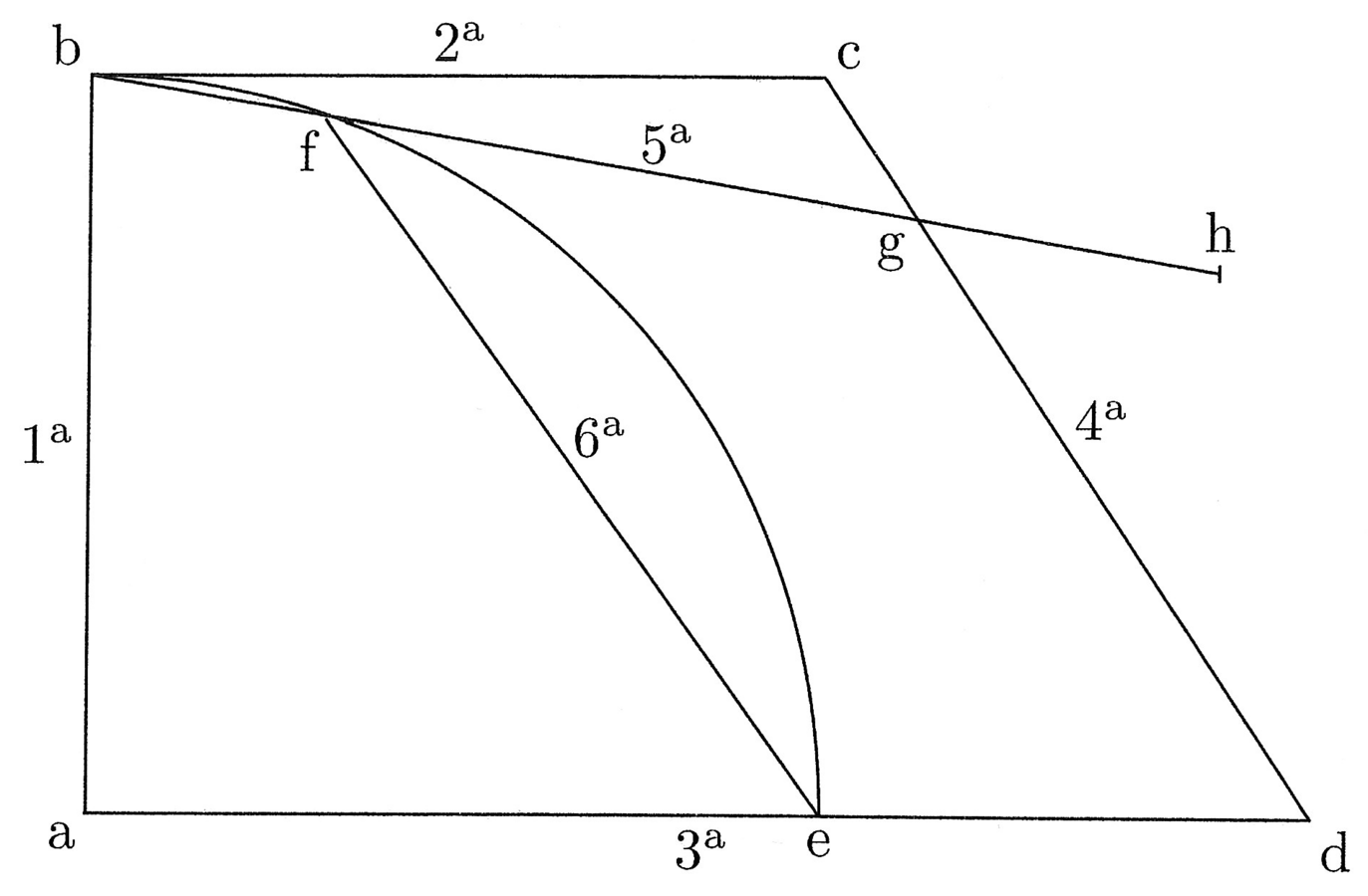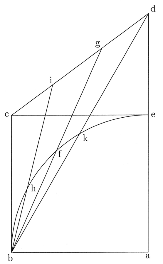 62. Descripta quarta circuli et linea prima a centro ad principium arcus tracta, et secunda linea de contactu primae cum arcu orthogonaliter eiusdem quantitatis cum prima, et tertia a centro per finem, quae sit ut latus trigoni inscripti circulo, et quarta de fine secundae ad finem tertiae. Si tunc de principio quadrantis lineam quintam duxeris ad quartam taliter, quod chorda, quae a contactu illius quintae, ubi curvam secaverit, ad finem totius quadrantis ducta, quae sit sexta linea, quintae fuerit aequalis, erit quinta minor quadrante quanta est medietas portionis eius cadentis inter curvam et quartam (cfr. figura 27). Sit super a centro quadrans be descriptus et linea prima ab, et secunda bc angulum rectum cum ab faciens aequalis eidem, et tertia linea aed ut latus trianguli inscripti, et quarta linea cd. Trahe deinde de b lineam ad cd, quae sit bg, et ubi secaverit quadrantem be, pone f, et sit quinta linea. De f trahe sextam, quae sit chorda fe. Dico si fe est ut bg, tunc bg est minor quadrante be medietate fg. Adde igitur medietatem fg super bg, et sit gh medietas fg. Dico bh aequari curvae be.