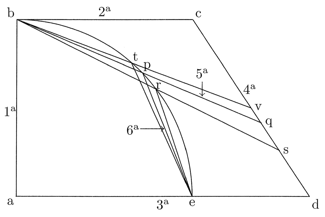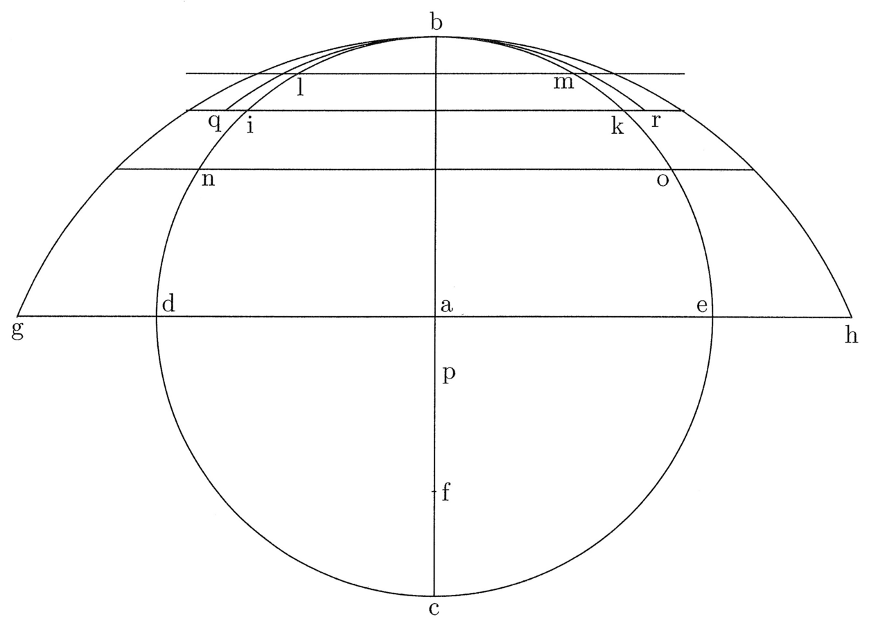 59. Ex quo curvae superficies sectionum, quae parabolae dicuntur, et transversalium cylindrorum non causantur directe ex motu lineae. Si volueris inquirere portionum illarum habitudines, ita facito: Considerabis excessum chordae super sagittam, et ille excessus erit ut motus lineae aequalis sagittae in uno eius puncto, alius motus alterius puncti erit ut curva. Unde superficies erit medium eius, quod fit ex ductu sagittae in curvam ac si non foret linea mota in uno eius termino, et erit ultra medium secundum habitudinem potentiae excessus arcus super sagittam ad potentiam curvae.