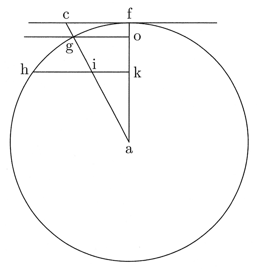 28. Dico igitur quod, si de h versus i signaveris sagittam alicuius polygoniae mediae et lineam de termino sagittae aequedistantem ad ai traxeris, tunc ch linea secabit illam in duas lineas, quarum minor erit pars sagittae et maior prima polygoniae illius. Puta sit hk sagitta tetragoni et trahatur de k aequedistans ad hf, quae sit kl, et ubi illam secat ch, pone m. Dico km fore duas tertias hk, quod de se notum est. Habet enim se mk ad kh sicut ci ad ih. Et dico ml fore primam lineam tetragoni. Si negaveris aut igitur dixeris tetragonum capaciorem aut incapaciorem: si capaciorem, tunc prima eius debet esse maior lm et tunc lk et kh simul sunt minores prima linea tetragoni, eius sagitta et duabus tertiis sagittae, quod implicat contradictionem. Nam si debet tetragonus esse capacior, ut dicis, oportet quod lk et kh excedant primam tetragoni, sagittam et eius duas tertias. Eodem modo implicat contradictionem, si dixeris tetragonum incapaciorem. Nam tunc oportebit lm esse minorem et lk et kh simul esse maiores prima linea tetragoni, sagitta et duabus tertiis eiusdem. Ita de aliis polygoniis. Quare patet, si prima circuli isoperimetri excedit primam trigoni per partem aliquotam sagittae trigoni, etiam excedit primam lineam cuiuslibet polygoniae mediae per similem partem aliquotam sagittae polygoniae illius, et dicere aliud implicat contradictionem.