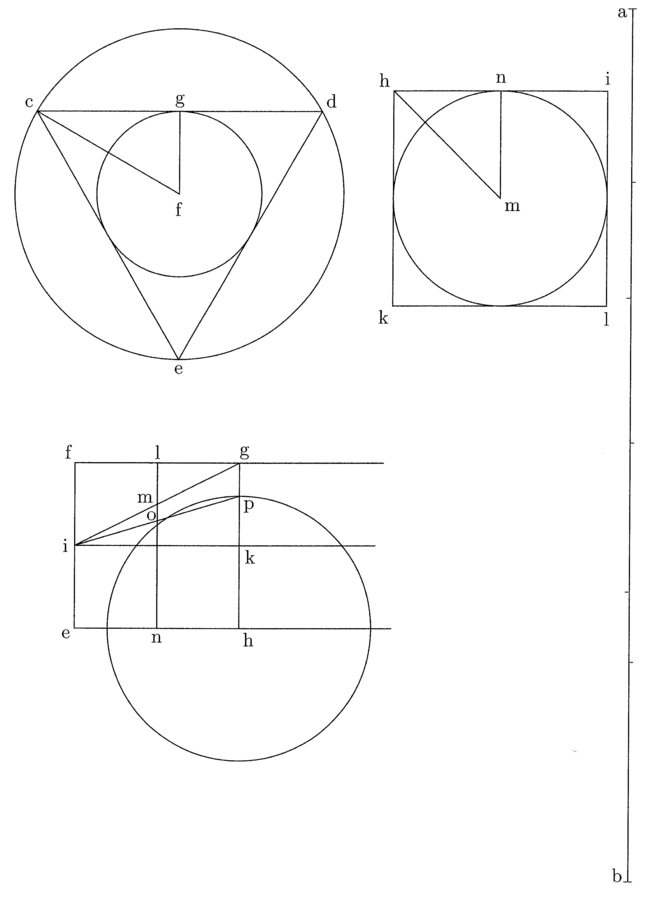 Manifestum est, cum habitudo sit nota, quod tunc uno excessu noto notus erit et alius. Sed quia excessus in tetragono, pentagono, hexagono vel alia media polygonia sciri potest per scientiam primae lineae trigoni et polygoniae mediae, tunc et circuli isoperimetri.