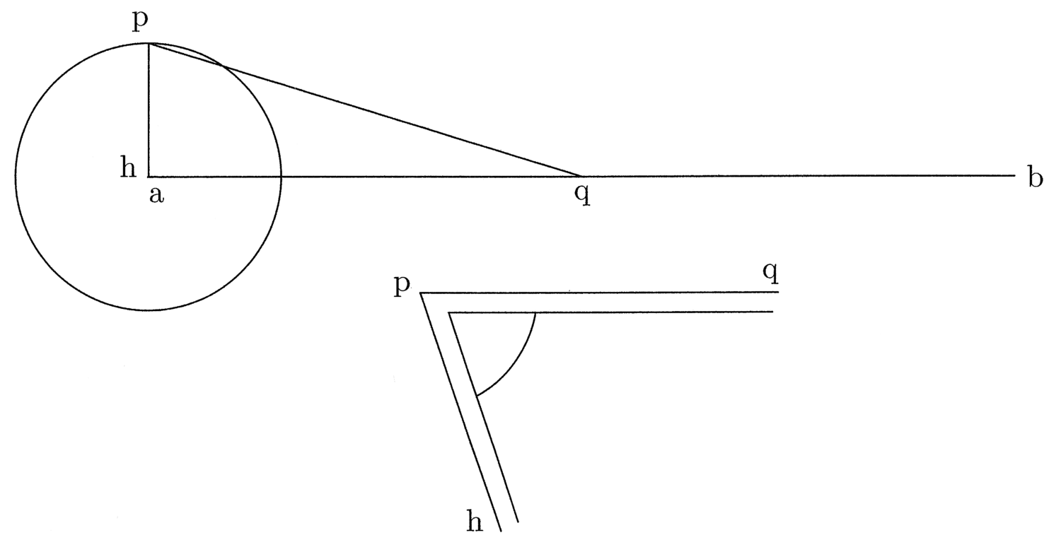 Istud si breviter facere volueris, facito angulum, per quem reperias hoc modo: Ad hp semidiametrum circuli praemissi iunge in centro lineam ab orthogonaliter et ad eius medietatem, quae sit q, trahe pq, et habes angulum hpq. Quem facito in aere aut ligno, et quando circularem lineam in rectam resolvere cupis, facito lineam indefinitae quantitatis, quae ad angulum rectum concurrat cum semidiametro in centro, et pone angulum in contactu semidiametri et circumferentiae minus latus super semidiametrum. Et maius latus anguli abscindet in linea indefinitae quantitatis portionem aequalem semiperipheriae.