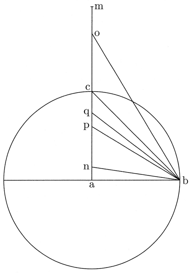 5. NICOLAUS. Bene dico igitur, quod sicut si acceperis bn cum quotquot volueris costis suis, linea quae oritur erit minor diametro circuli circumscripti trigono et tot semidiametris dati circuli, quot costas addideris, una costa dempta. Et si acceperis bo cum tot costis suis sicut volueris, exsurget linea maior semidiametro circuli circumscripti trigono et tot semidiametris dati circuli, quot costas addideris, una dempta. Igitur etiam erit punctus inter n et o, ad quem si de b lineam traxeris, sic se habebit, quod ipsa erit aequalis diametro circuli circumscripti trigono et tot semidiametris dati circuli, quot costas addideris, una dempta. Hoc autem non est possibile nisi in puncto c, cuius costa est ut semidiameter dati circuli, scilicet ut ba; alias, si costa foret maior aut minor quam ba, non erit hoc possibile.