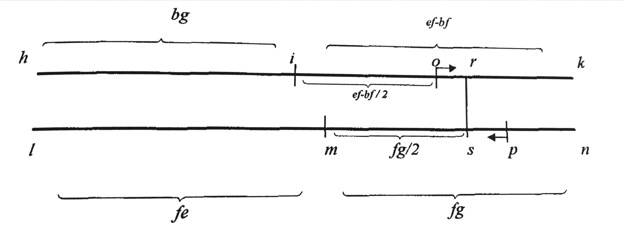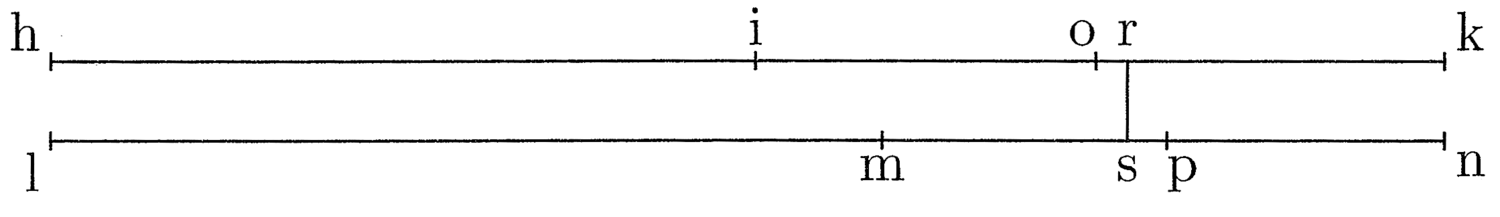 5. Supponi che la quinta bg aggiunta alla metà della differenza tra la sesta fe e la corda della quinta bg, e la sesta ef aggiunta alla metà del segmento fg siano contemporaneamente uguali al doppio della curva be, e che la differenza tra ef e fb sia maggiore di fg. Sia dunque la linea hi uguale alla quinta bg, a cui si somma la differenza, che sarà uguale a ik. Sotto la linea data sia tracciata un’altra linea lm uguale alla sesta fe, alla quale si aggiunge il segmento fg, e sia mn uguale a fg; la linea hk è uguale alla linea ln. Si segni la metà della differenza, che è io, e la metà del segmento, che è mp. Si tracci la perpendicolare tra p e o, che è rs. Dunque, quanto minore è ms rispetto alla metà del segmento, che è mp, tanto maggiore è ir rispetto alla differenza, che è io. Perciò ls sarà uguale alla curva be. E così la sesta lm aggiunta alla metà del segmento è maggiore della curva be. Quindi laddove la sesta, aggiunta alla metà del segmento deve essere uguale alla curva be, la metà della differenza non sarà maggiore della metà del segmento (cfr. figura 2).