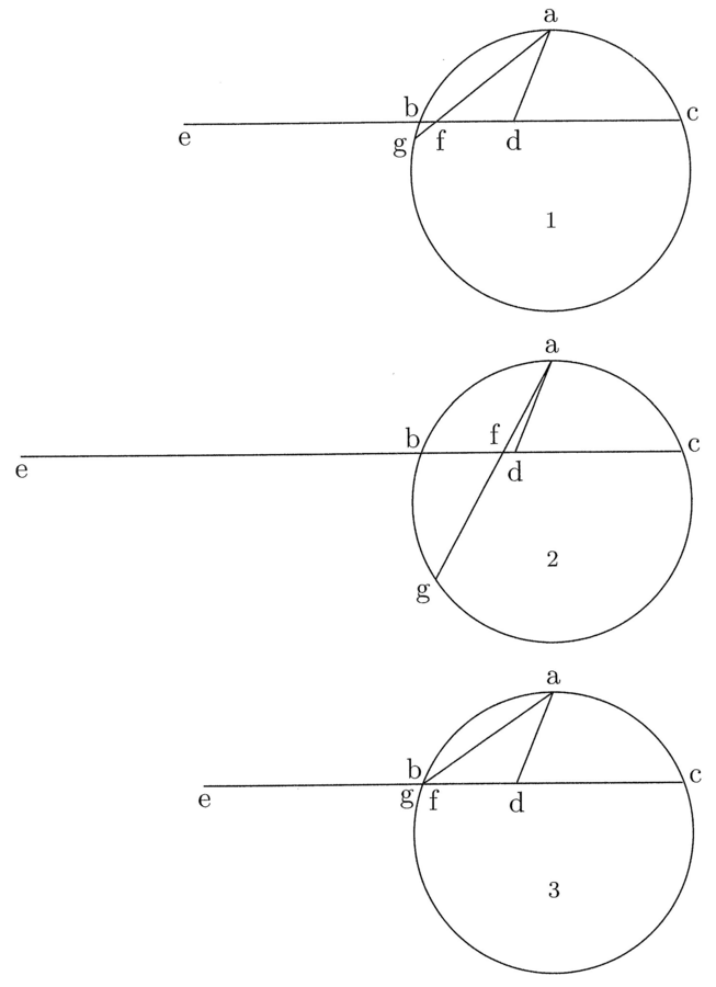 7. Per vedere che d è il punto di questa regola, il quale, se la corda ag ha la stessa misura dell’arco ba, dista la metà di ag dal punto di intersezione f, dove ag interseca bcd6, considera che quanto maggiore è la corda bc, tanto più [il punto] d si allontana da b e da a e si avvicina al centro del cerchio; quanto minore [è la corda bc], avviene il contrario, e ciò è evidente (cfr. figura 3).