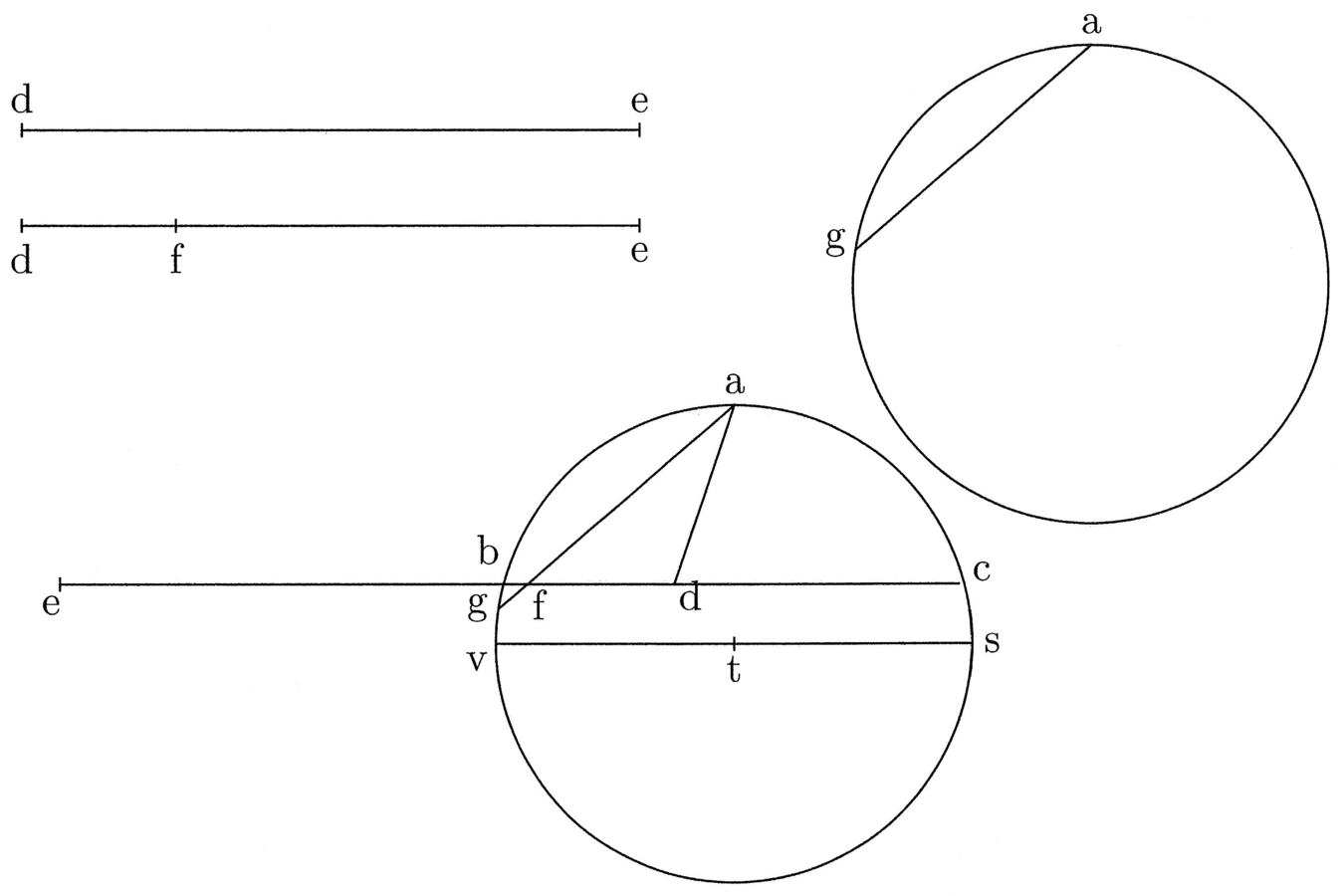 Sia data la retta de; sia dato un cerchio il cui centro è t e il diametro stv; e sia a il centro di tutti gli archi. Da a traccia la corda ag, uguale alla metà di de, e su de segna la sua quarta parte con df, e avvicina de parallelamente a tv, in modo che f cada sulla corda ag e indica con b il punto d’intersezione con la circonferenza del cerchio. Allora, se d è equidistante da b e da a, ba sarà la metà dell’arco cercato. Prolunga quindi bd fino a toccare la circonferenza in c e otterrai l’arco bc della stessa misura della retta de. Il tutto è evidente da quanto detto sopra.