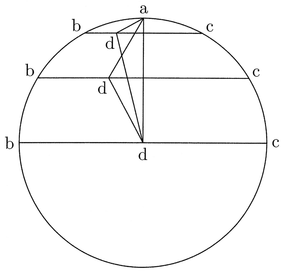 Dunque, sulla massima corda, d si allontana minimamente dal centro del cerchio e massimamente da b e da a. Sulla corda minima, d si allontana massimamente dal centro e minimamente da b e da a. Perciò, d si trova, sulla corda massima, al centro del cerchio e, su quella minima, sulla sua circonferenza7. Ma è certo che, sia sulla massima corda sia su quella minima, d è equidistante da b e da a e lo stesso è su tutte le corde intermedie. Da ciò, si deduce che se bc è la corda dell’arco pari alla terza parte della circonferenza del cerchio, allora il punto d sarà equidistante dal centro e da b ed a.