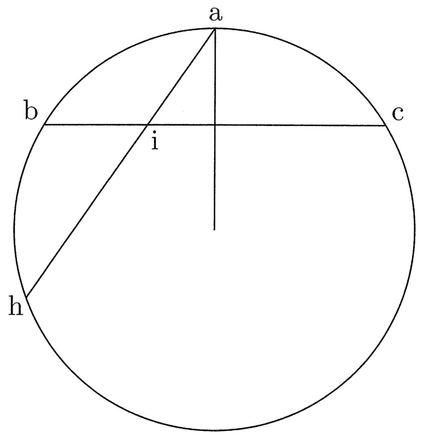 8. Inoltre, si può tracciare da a attraverso bc la corda ah che taglia [bc] nel punto i (cfr. figura 4). Dico che aih può essere tracciata così che ai sarà la distanza del punto d da a su questa corda ah. Questo è certo. Così sarà anche quando ah è uguale a bc e il punto di intersezione i sarà equidistante da b e da a, come d lo sarà da entrambe. E se ah è minore, questo non è possibile, perché allora ai sarebbe maggiore di prima, quando essa era uguale. E se ah è maggiore, è altrettanto impossibile, perché ai sarebbe minore di prima, quando essa era uguale.