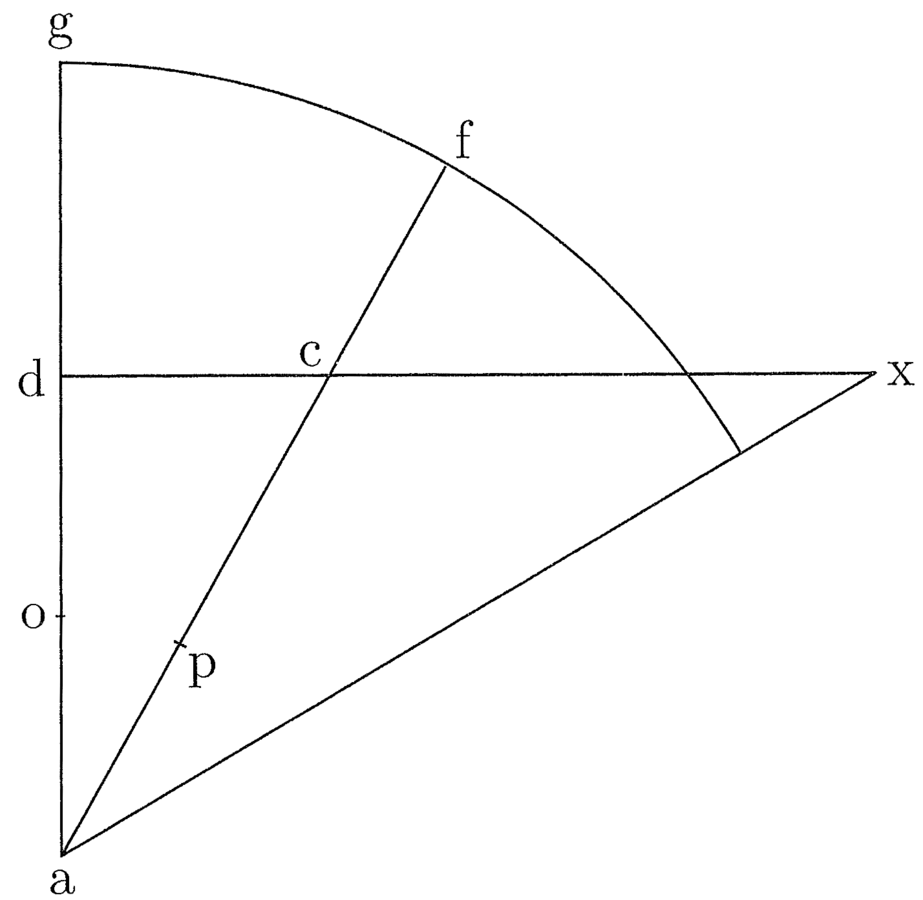 4. Se dal centro a di un cerchio dato tracci [due] linee verso due punti della circonferenza, g e f, distanti l’una dall’altra un dodicesimo della circonferenza e se da un punto d della linea ag conduci all’infinito la perpendicolare che taglia af in modo che la linea compresa tra il punto d’intersezione c e la circonferenza sia la metà di ad e se indichi con x il punto sulla perpendicolare tale che la linea tracciata dal centro a verso questo stesso punto sia il doppio della linea ad, allora dx sarà un sesto della circonferenza del cerchio dato (cfr. figura 1).
