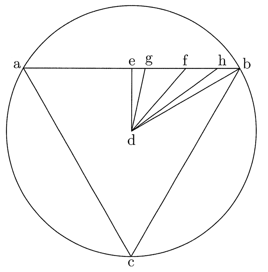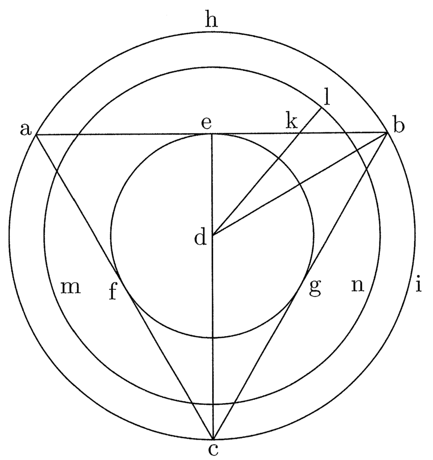 12. Ad declarandum autem propositionem fiat trigonus abc, cui inscribatur circulus super d centro, qui sit efg, et circumscribatur circulus hi; ducaturque linea de sic, quod e sit punctus medius inter a et b, et ducatur linea db. Ducaturque linea de d ad punctum medium inter e et b, quae sit dk. Dico dk esse minorem semidiametro circuli isoperimetri trigono, quantum est quarta ipsius dk (cfr. figura 1).