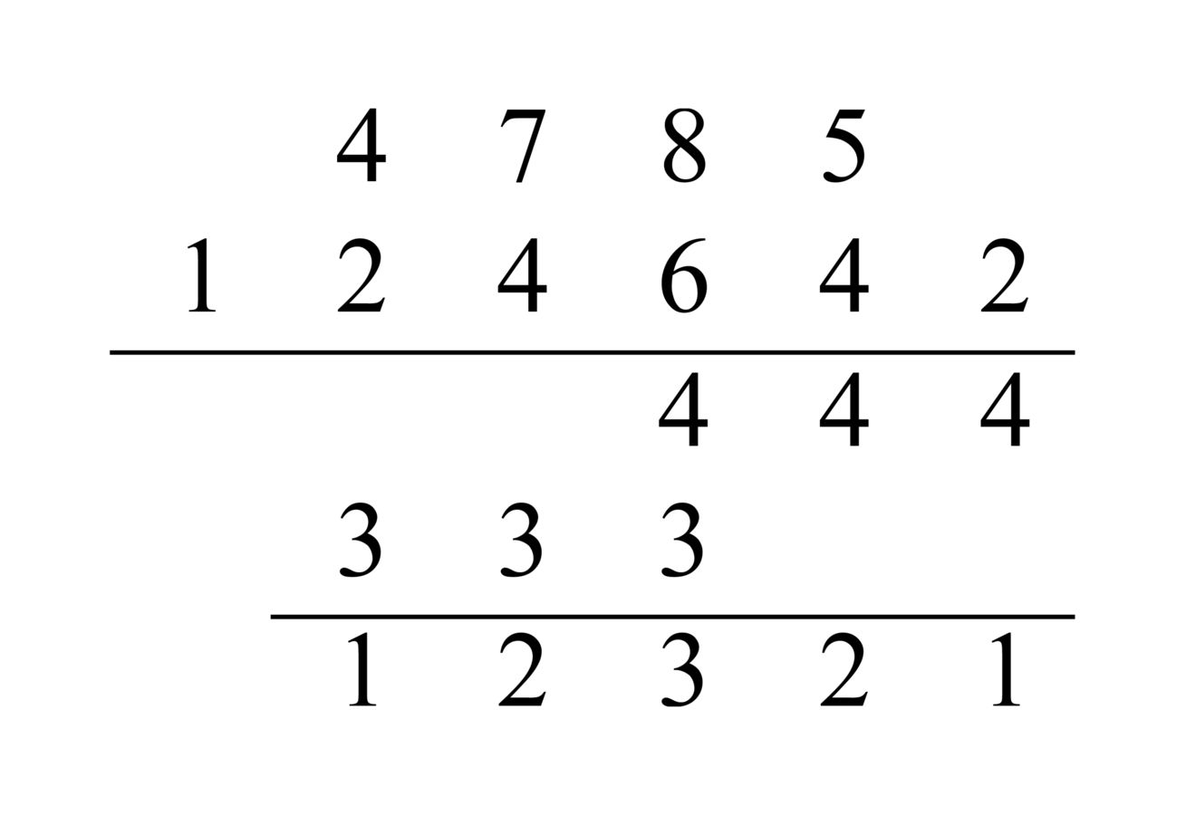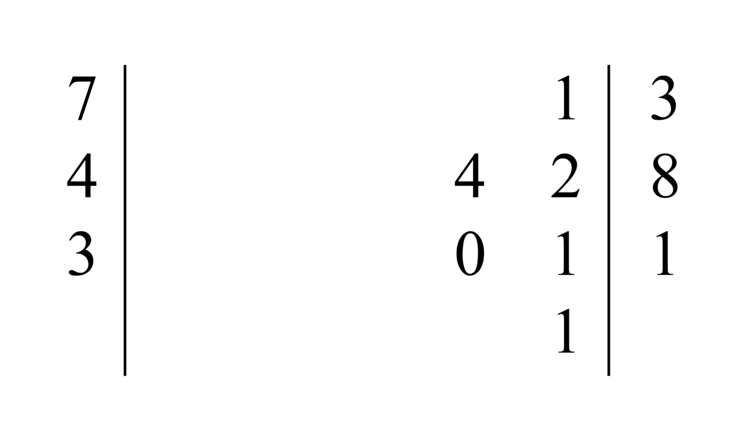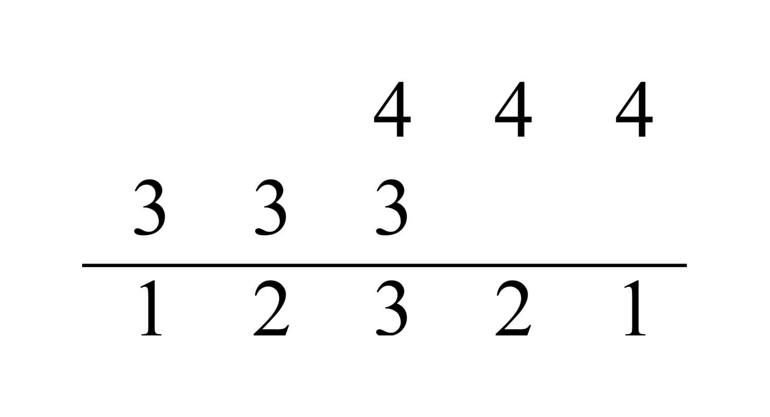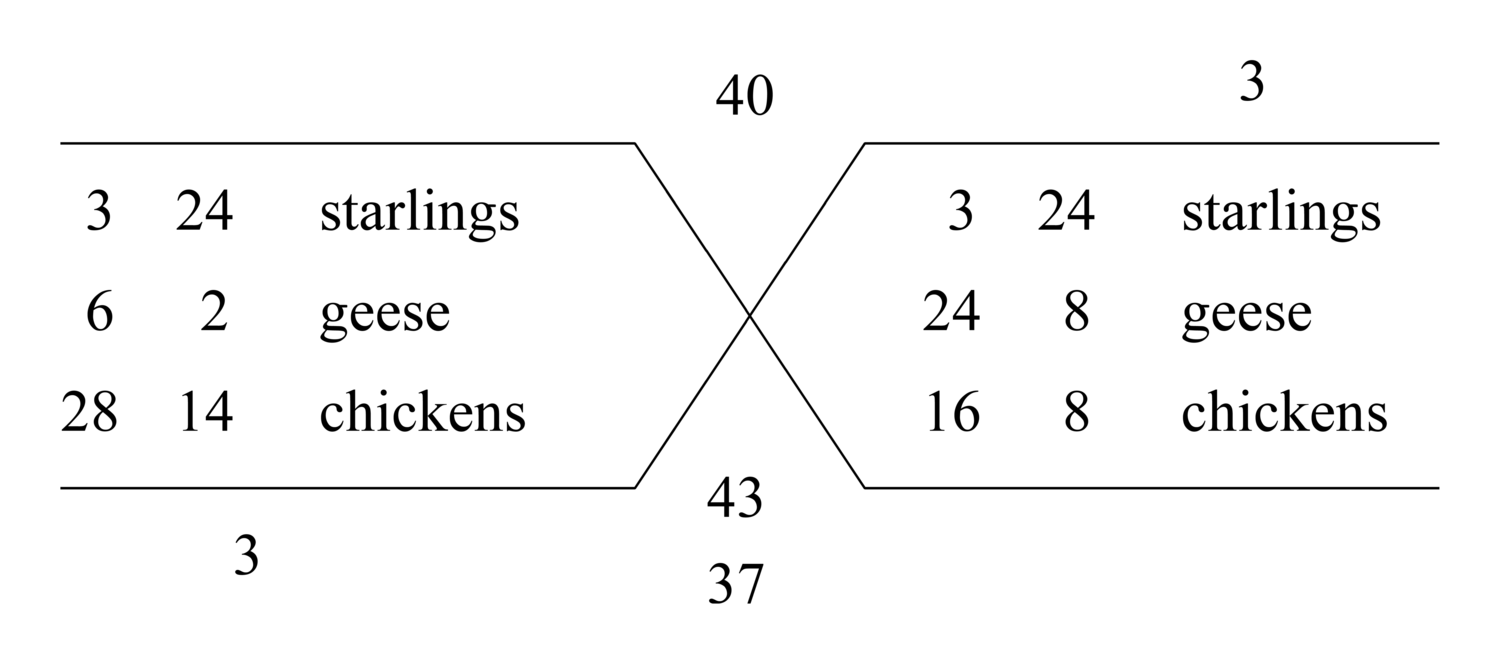 106.11 Another type [of multiplication] requires that the [numbers of] digits of the multiplicands be equal, and that the digits in each rank of the ranks in each line also be equal. The way to write it down is similar to the way [for the method] by erasing. Then you write a one below the first rank of the ranks of the upper line, and a two below the second [rank], likewise increasing by one until you reach the last rank of the multiplicand. What is below it is shared with the first rank of the multiplier. From the second rank of the multiplier you begin decreasing one by one until you reach the last rank of the multiplier. These written numbers are all on a third line. The indexes of the ranks of the multiplicand are in the correct order, but the indexes of the ranks of the multiplier are reversed. Then you multiply the number of the rank of the multiplicand by the number of the rank of the multiplier. The result is multiplied by what is in the written line, and the result is the required number. This type of multiplication is called “by repetition”.