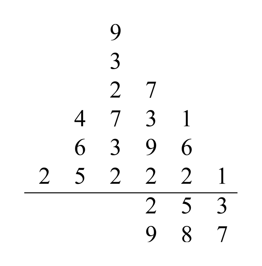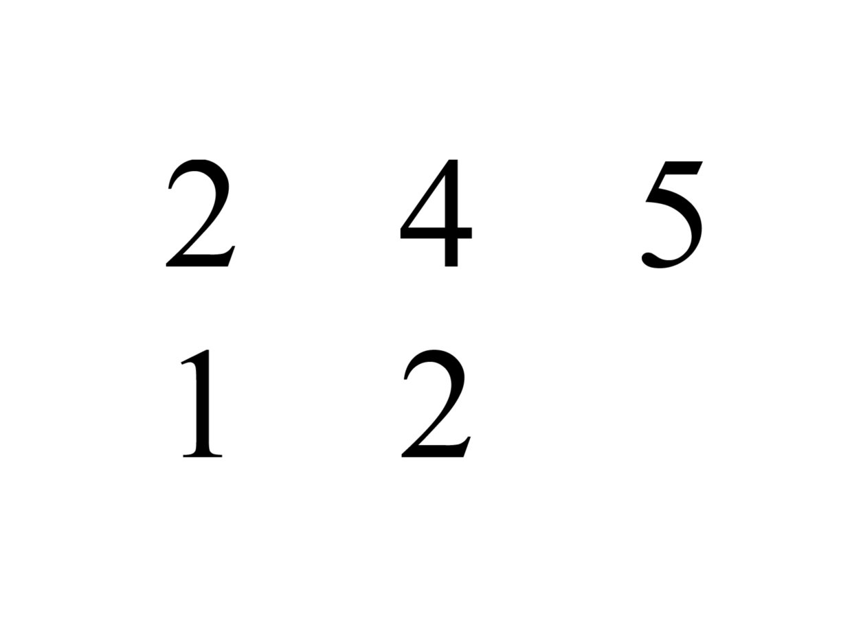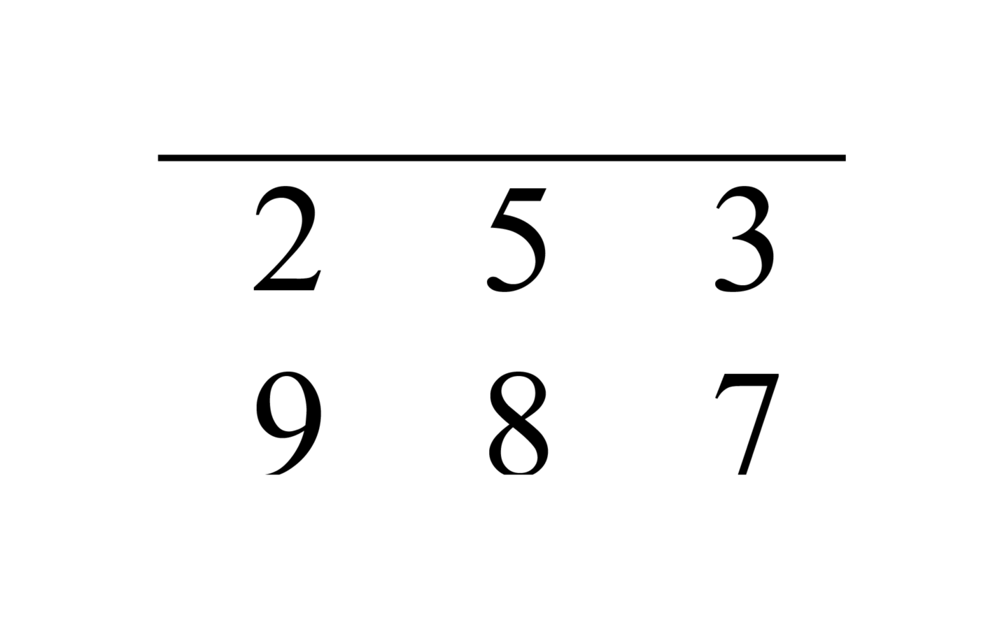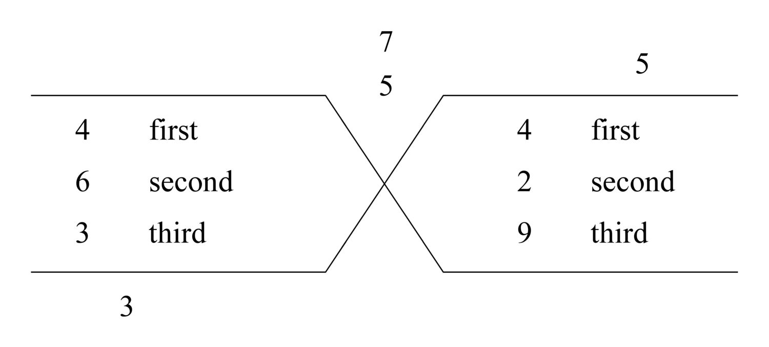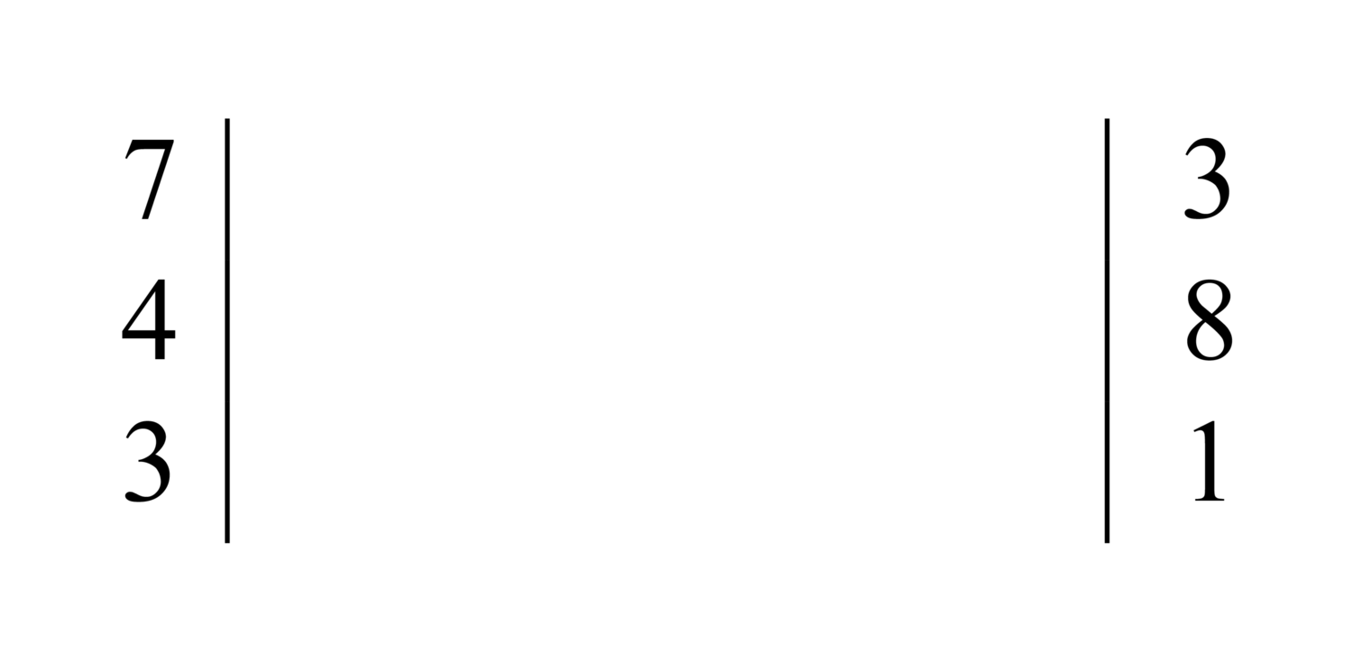 106.11 Another type [of multiplication] requires that the [numbers of] digits of the multiplicands be equal, and that the digits in each rank of the ranks in each line also be equal. The way to write it down is similar to the way [for the method] by erasing. Then you write a one below the first rank of the ranks of the upper line, and a two below the second [rank], likewise increasing by one until you reach the last rank of the multiplicand. What is below it is shared with the first rank of the multiplier. From the second rank of the multiplier you begin decreasing one by one until you reach the last rank of the multiplier. These written numbers are all on a third line. The indexes of the ranks of the multiplicand are in the correct order, but the indexes of the ranks of the multiplier are reversed. Then you multiply the number of the rank of the multiplicand by the number of the rank of the multiplier. The result is multiplied by what is in the written line, and the result is the required number. This type of multiplication is called “by repetition”.