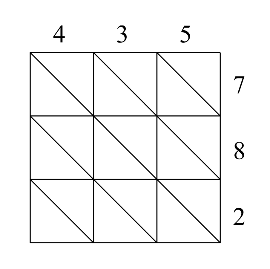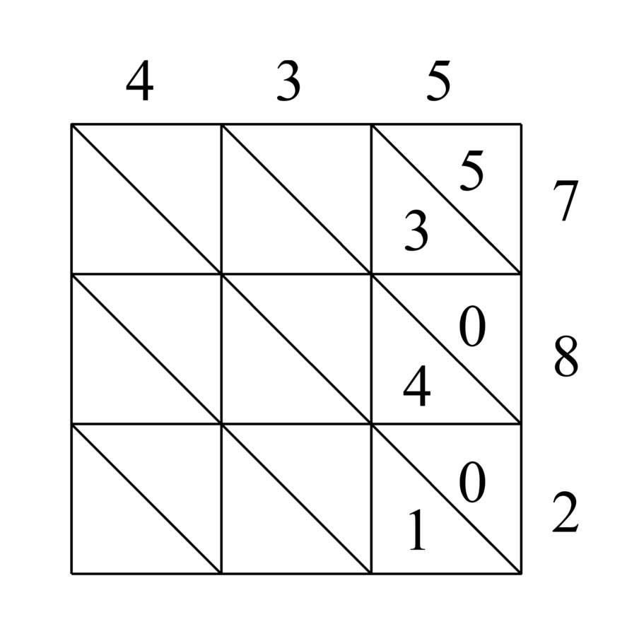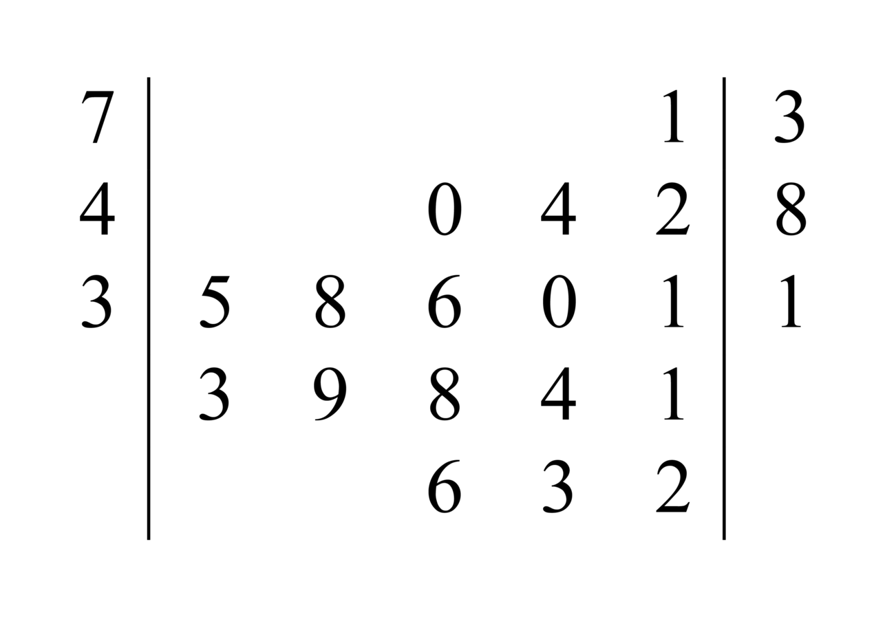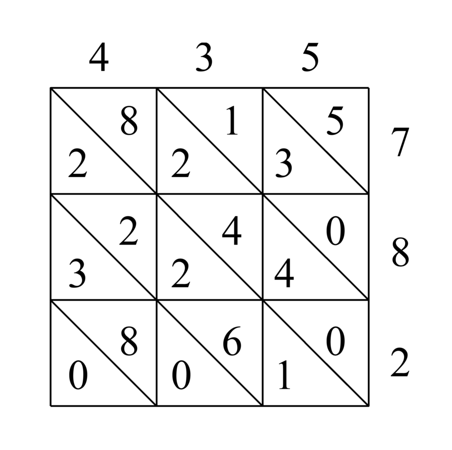 99.14 The third kind is multiplication without shifting, of which there are several types. One is table multiplication, in which you draw a quadrilateral surface, extending length and width according to the ranks in the two numbers to be multiplied. You draw diagonals through its squares from the lower right to the upper left, and you write the multiplicand above the quadrilateral, matching each digit with a column. Then you write the multiplier down the left or right side of the quadrilateral, so that each digit also corresponds to a row. Then you multiply digit after digit of the multiplicand by all the digits of the multiplier, and you put the digits of each rank in the intersecting square. And the meaning of “intersection” is where they meet. You put the units above the diagonal and the tens below it. Then you begin adding from the upper right corner. You add what is between the diagonals, without erasing, and you write each number in its rank, and you add the tens of each sum to the next diagonal. You then put it together, and the sum that you obtain is the result.