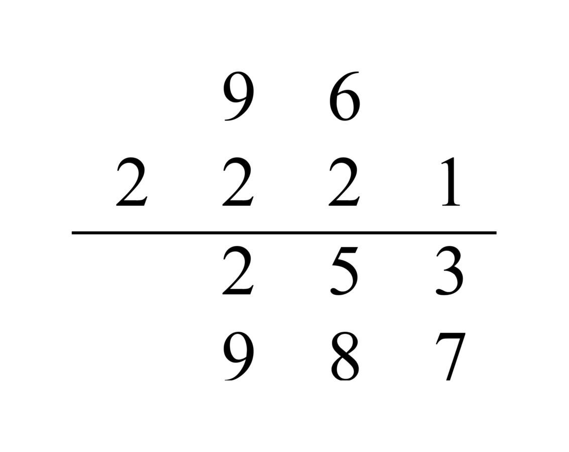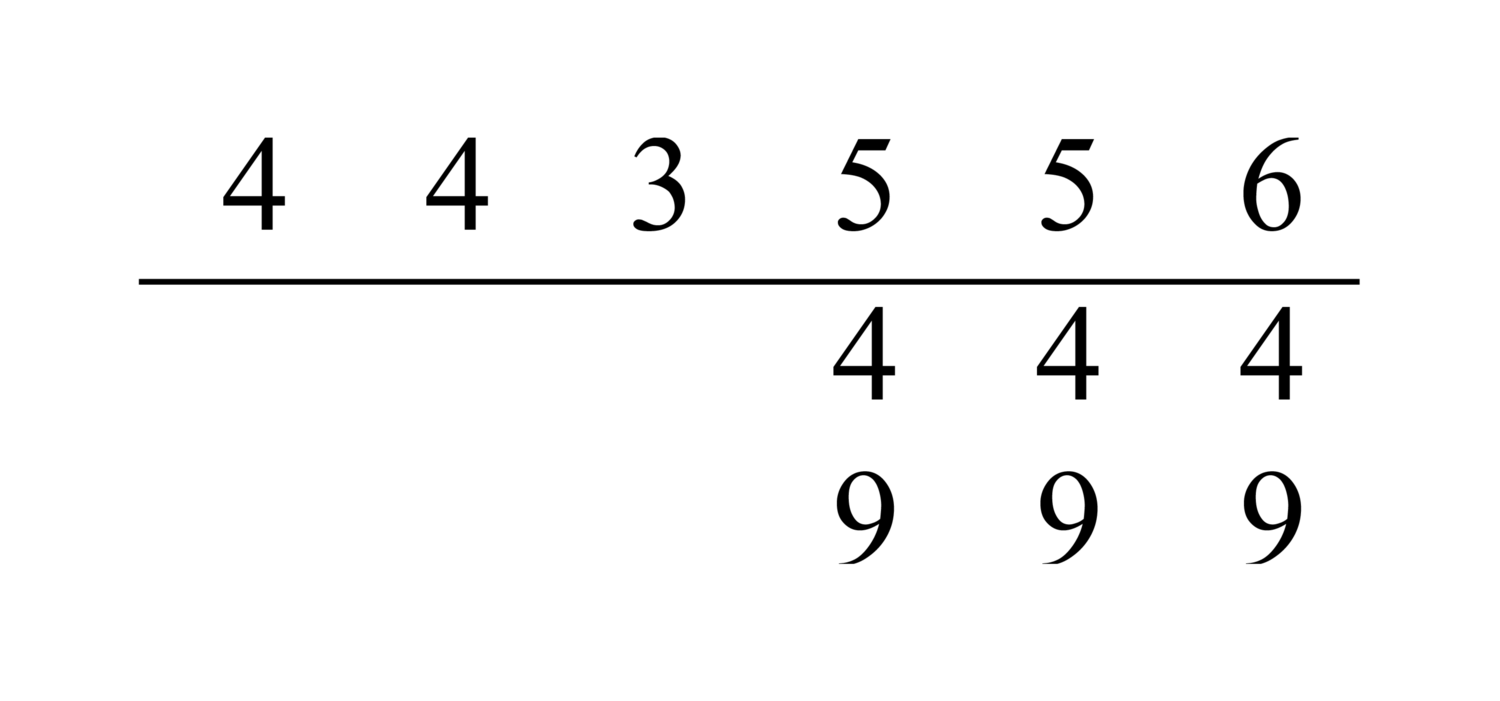 112.5 Another type of multiplication of nines has no condition. Instead, the digits in one of the lines are nines, and the digits in the other line can be whatever they are, and the number of places can also be whatever they are. To work it out, you add as many zeros to the ranks of the other line as the number of ranks of the nines. Then you subtract from the total the number different from the nines, leaving the answer.53