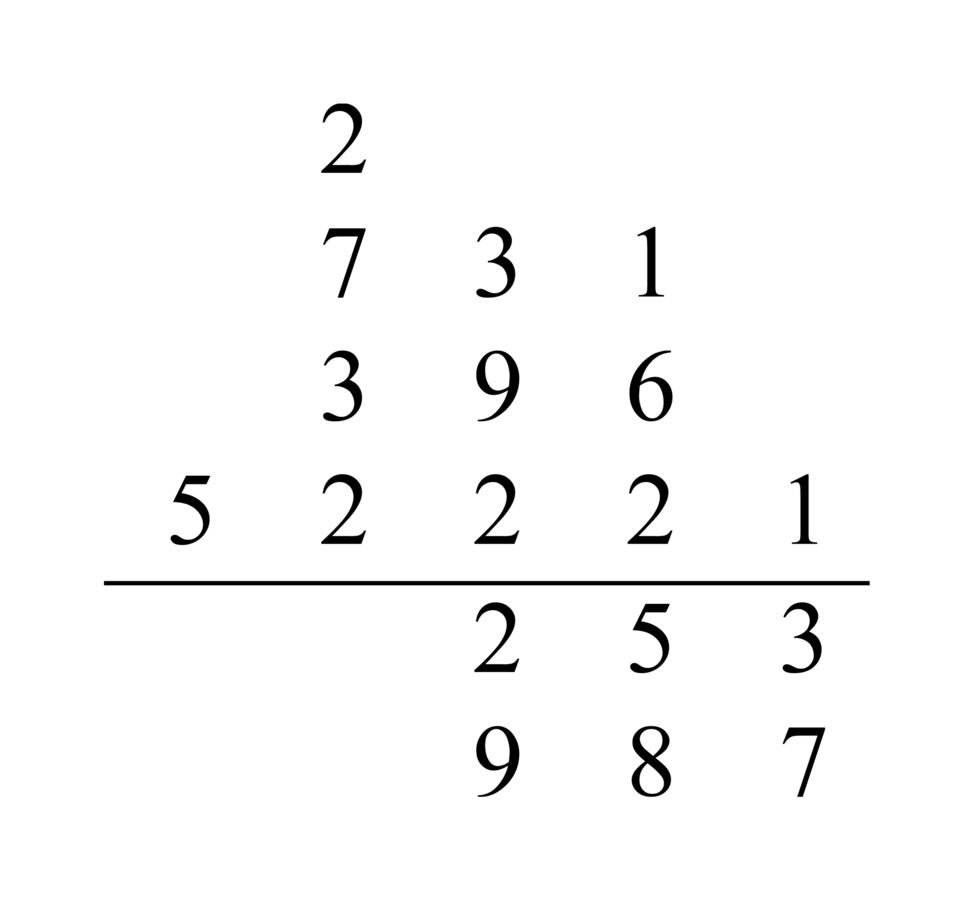 75.9 Here is another example, adding from the last rank. Suppose we want to add nine hundred seventy-eight to four hundred fifty-six. We put them down on two lines, as mentioned, as in this figure: