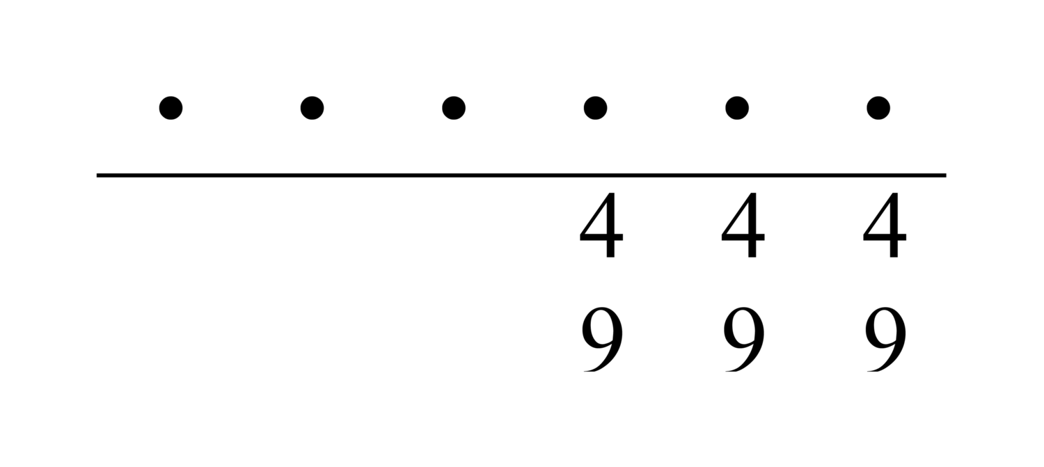 111.7 [Another type] is multiplication of “nines”, with the requirements that the [numbers of] ranks in the two lines be equal, one of them consist of all nines, and the digits of the other be equal. A description of the procedure is that you write down the two parallel lines, one of them below the other, and you put dots above them, as many as there are places in them. You multiply the digit of the place of one of them by the digit of the place of the other. You put the units of the result in the first of the dots, and its tens in the middle of the remaining dots. You note the difference between the nine and the digit of the multiplier. Then with [this difference] you fill in what is between the two digits of the results, I mean the units and the tens, and you fill the remaining dots with the digit that is different from the nine. What this yields is the answer.52
