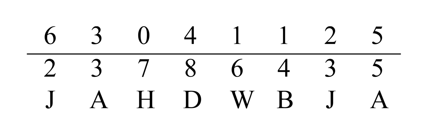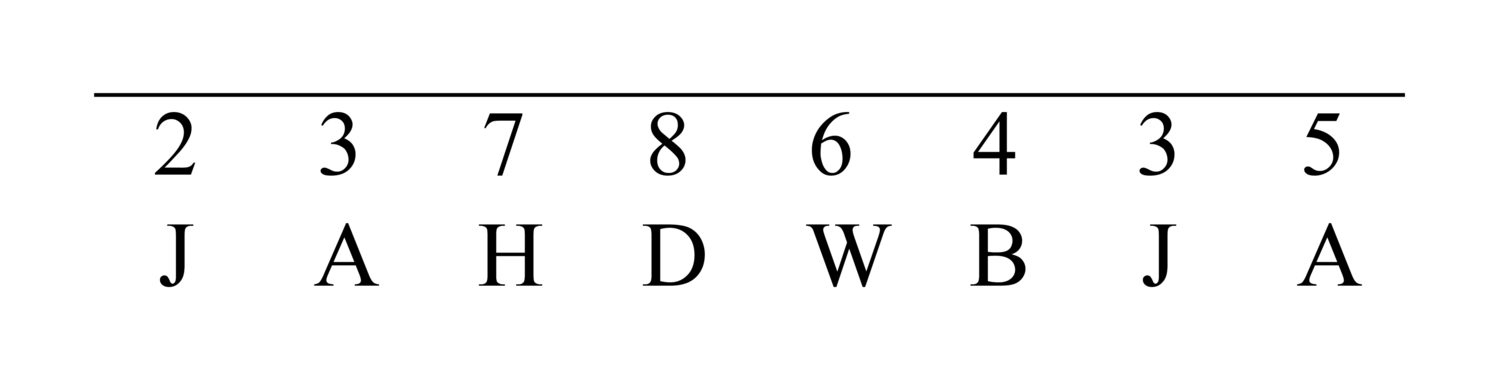 89.4 For example, suppose we want to cast out [sevens from] twenty-three million seven hundred eighty-six thousand four hundred thirty-five. We write it down on a line and we draw a line above it. We write the letters below it, each letter below a number consecutively. If we run out of letters and we have not run out of digits, we repeat the letters for the remaining [digits]. This is what he meant when he said “and from there the cycle begins again”. That is, after the H, and for the rest of the number, the letters are repeated along with the quantity with it. The figure always looks like this: