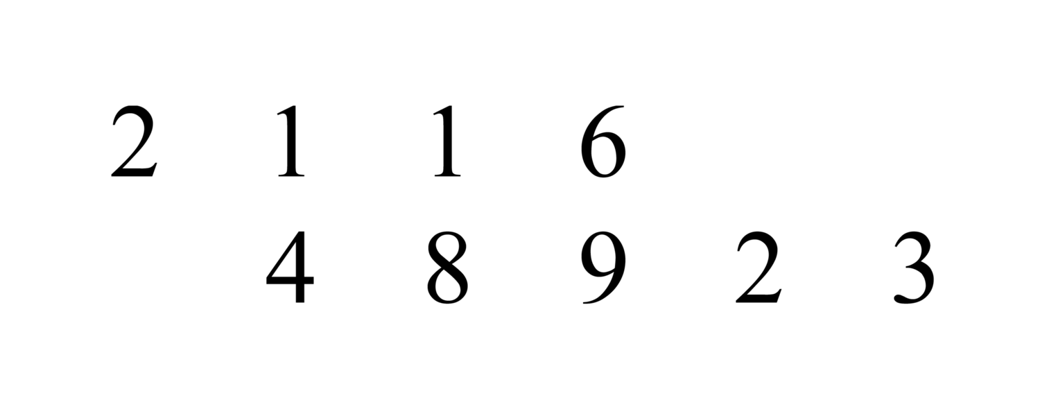 74.17 Here is an example of adding from the first digit. Suppose we want to add four thousand forty-three to two thousand six hundred eighty-five. We write the addend on a line and the augend below it on another line parallel to it, as mentioned, as in this figure:
