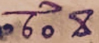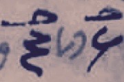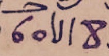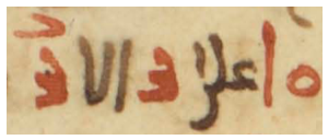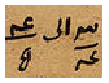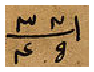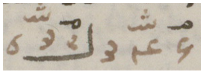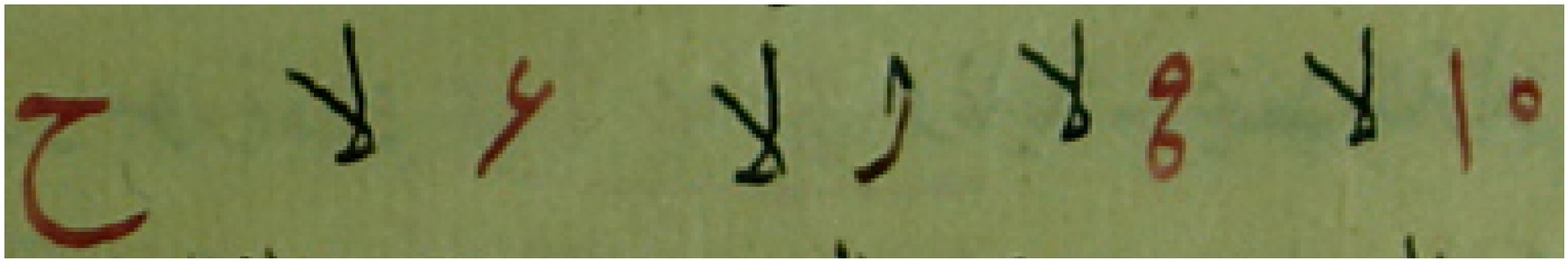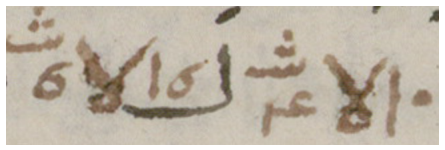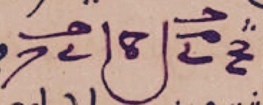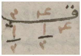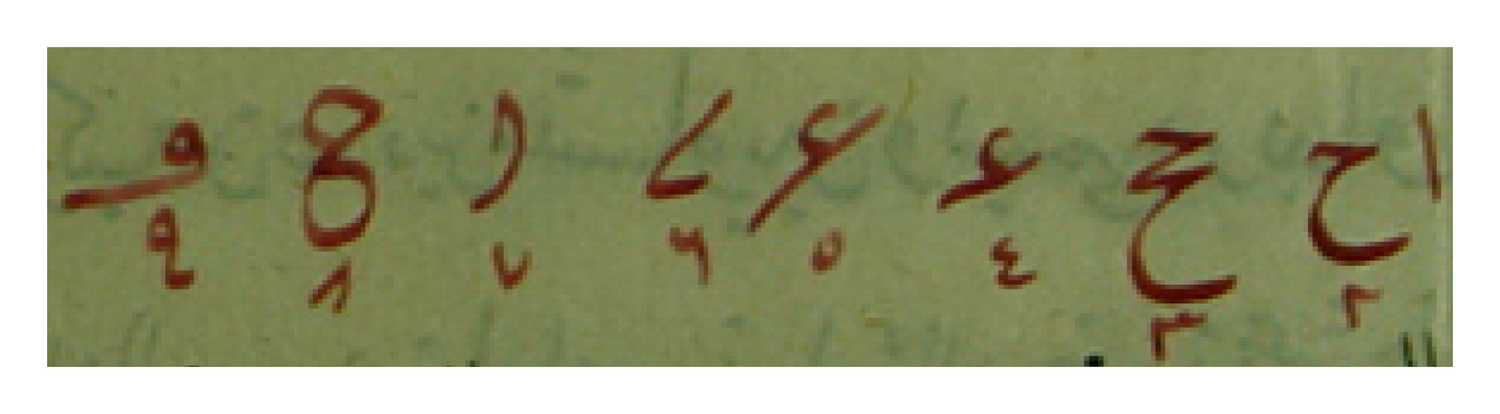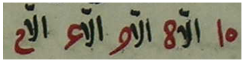 Starting from the right, the “1” looks like the letter alif, which is just a vertical line. The “2” is written as the letter ḥā, and the “3” is the ligature of the letters ḥā and jīm, pronounced ḥajja as if it were a word. The “4” should be the ligature of ʿayn and wāw, pronounced ʿuw, but the copyist forgot to add the waw. See below in Figure 2 for the “4” in the Istanbul manuscript. The “5” is shown as an ʿayn alone, so it looks like the “4” in this figure. The “6” is shaped like the letter hā (the copyist failed to close the loop), the “7” like an anchor, and the “8” is said to be a couple zeros (small circles), one above the other, connected by a vertical line (the alif). The line is not evident in the figure, and is generally not written at all. The Tunis manuscript writes the “8” the normal way, as , but just below it follows the instructions with the vertical line: