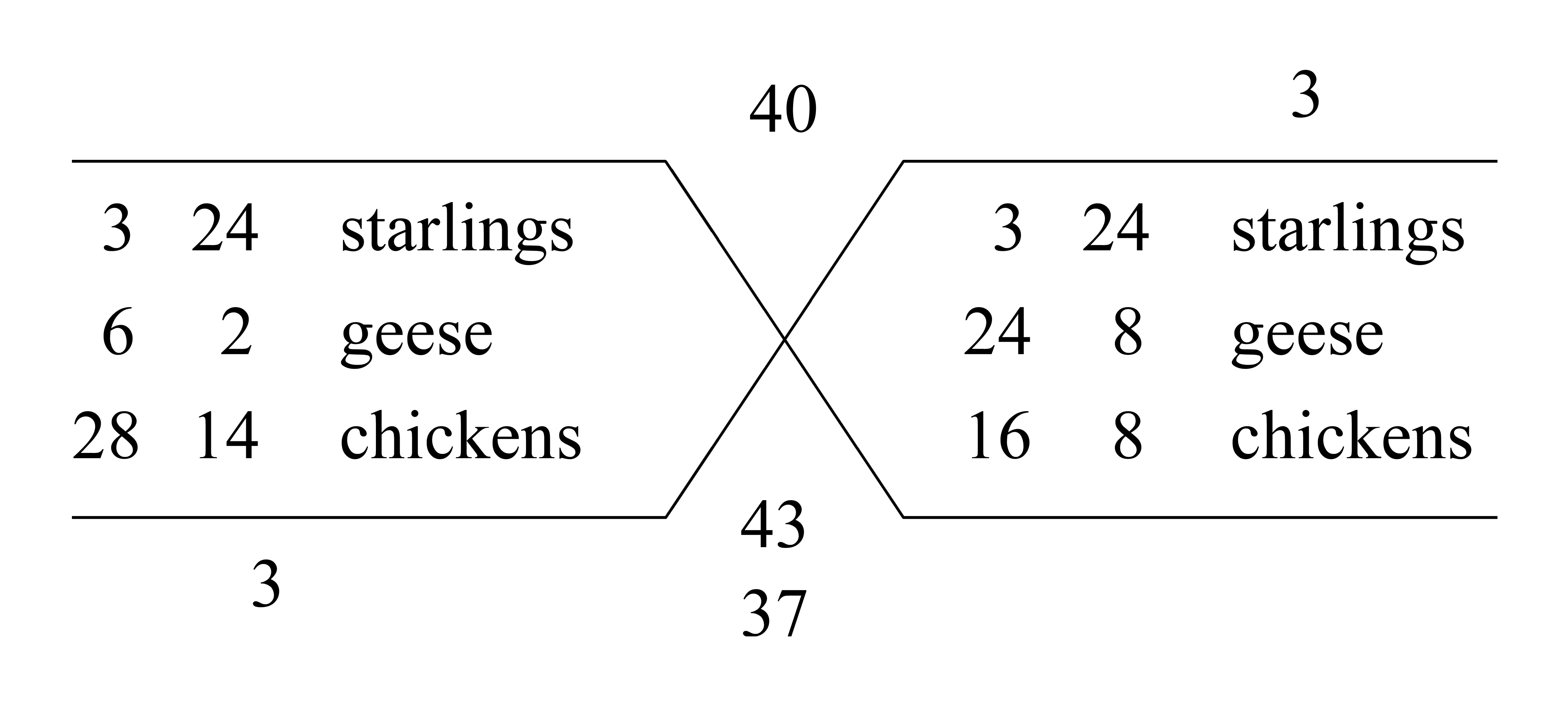 Because the transcribed notation for algebra is entirely different from our notation, we include the versions of the calculations in modern notation as well, even if it sometimes makes little sense (as in the calculations from through 222.1).
