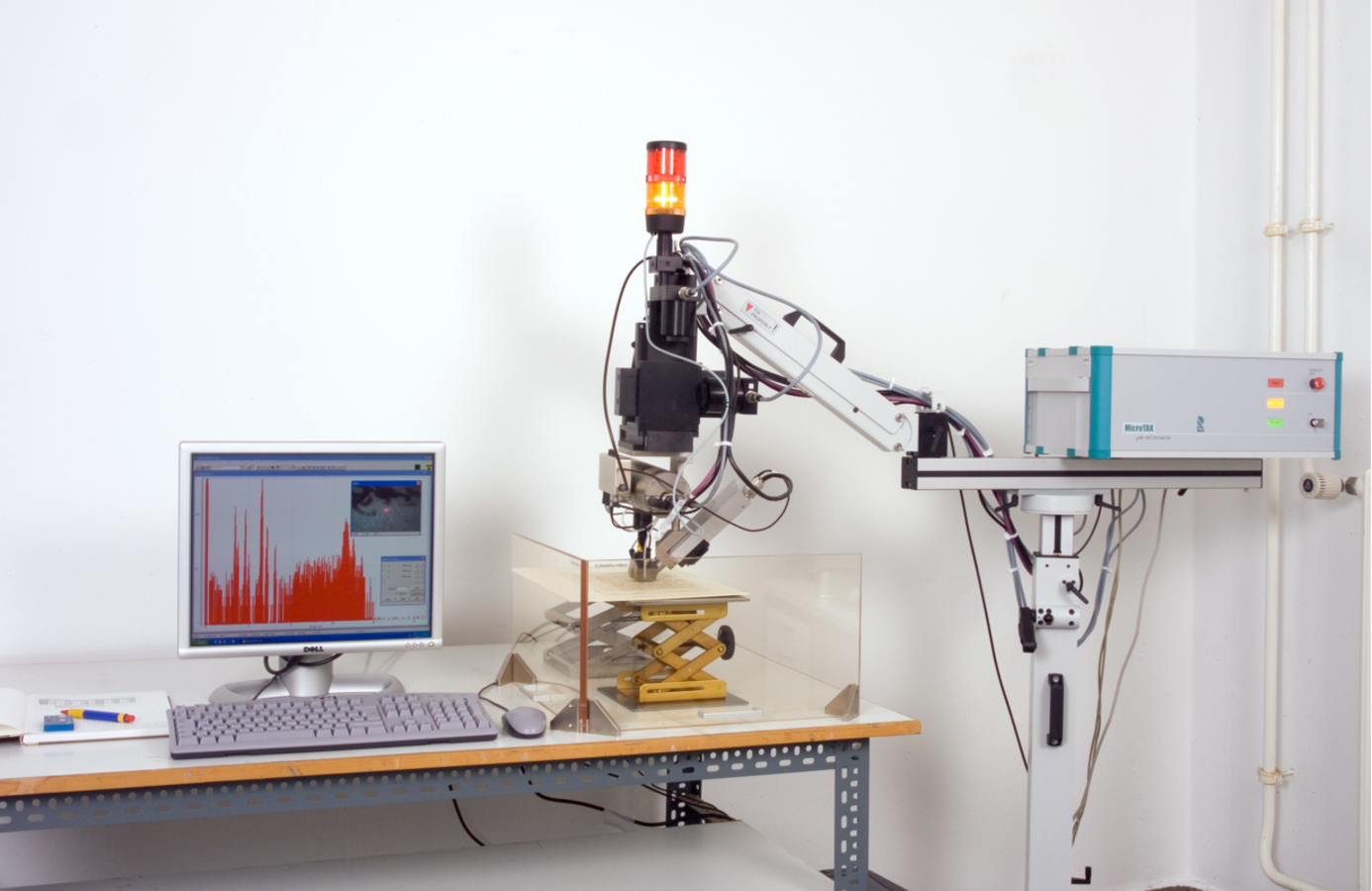 Analyses were carried out with the mobile energy dispersive micro-X-ray spectrometer ArtTAX® (formerly Röntec-GmbH, Berlin, Germany, see figure 11.1), which consists of an air-cooled low-power molybdenium tube, polycapillary X-ray optics (measuring spot size 70 µm diameter), an electrothermally cooled Xflash detector, and a CCD camera for sample