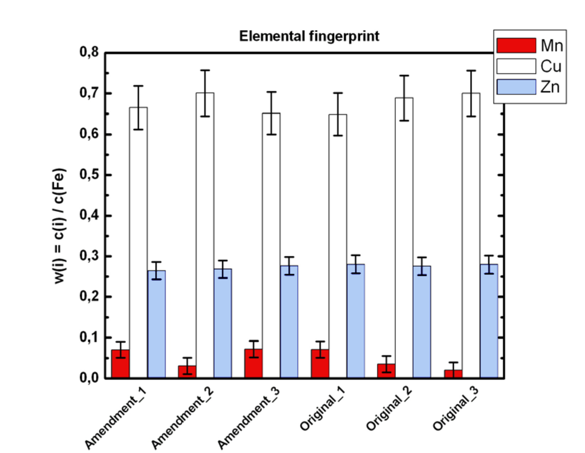 The chemical composition including trace components is a characteristic property of an art object. As mentioned before the qualitative and quantitative investigation of minor or trace components leads to composition fingerprints which allow to differentiate between varying iron gall inks. This is usually not possible by means of visual examination or with further non-destructive techniques.