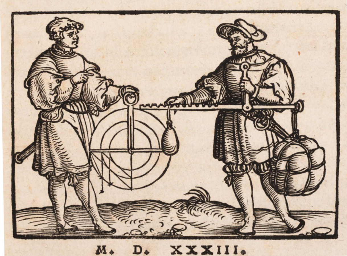 Fig. 3.5: Title vignette of Apianus' edition of Jordanus' Liber de ponderibus displaying a scholar and a practitioner. The scholar explains the functioning of a steelyard according to Aristotelian principles.