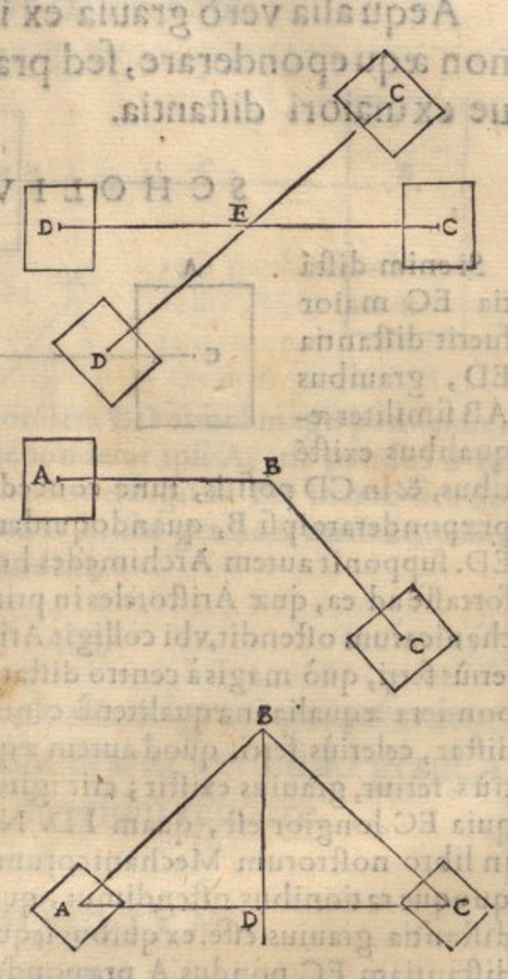 Whether and under what circumstances an equilibrated balance deflected into an oblique position returns into the horizontal is a question that goes back to the second problem of the Aristotelian Mechanical Problems. This, however, deals with balances having a beam of finite thickness so that it makes a difference whether they are supported from above or from below. But the seemingly simple case of the beam being supported at its center of gravity is not discussed. The concept of a center of gravity in fact was unknown to the Aristotelian author. As far as we know, this concept, which immediately suggests one stance in the later controversy, was not introduced before Archimedes.9 As will become clear below, it was Guidobaldo who revived and applied this concept in the context of the controversy about the deflected balance.
