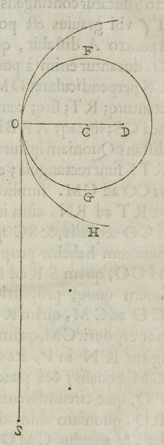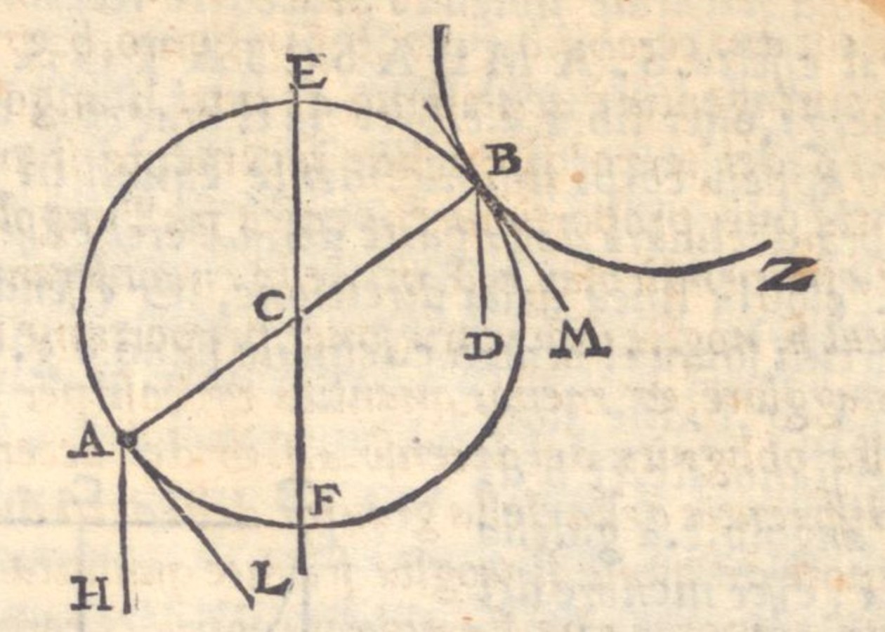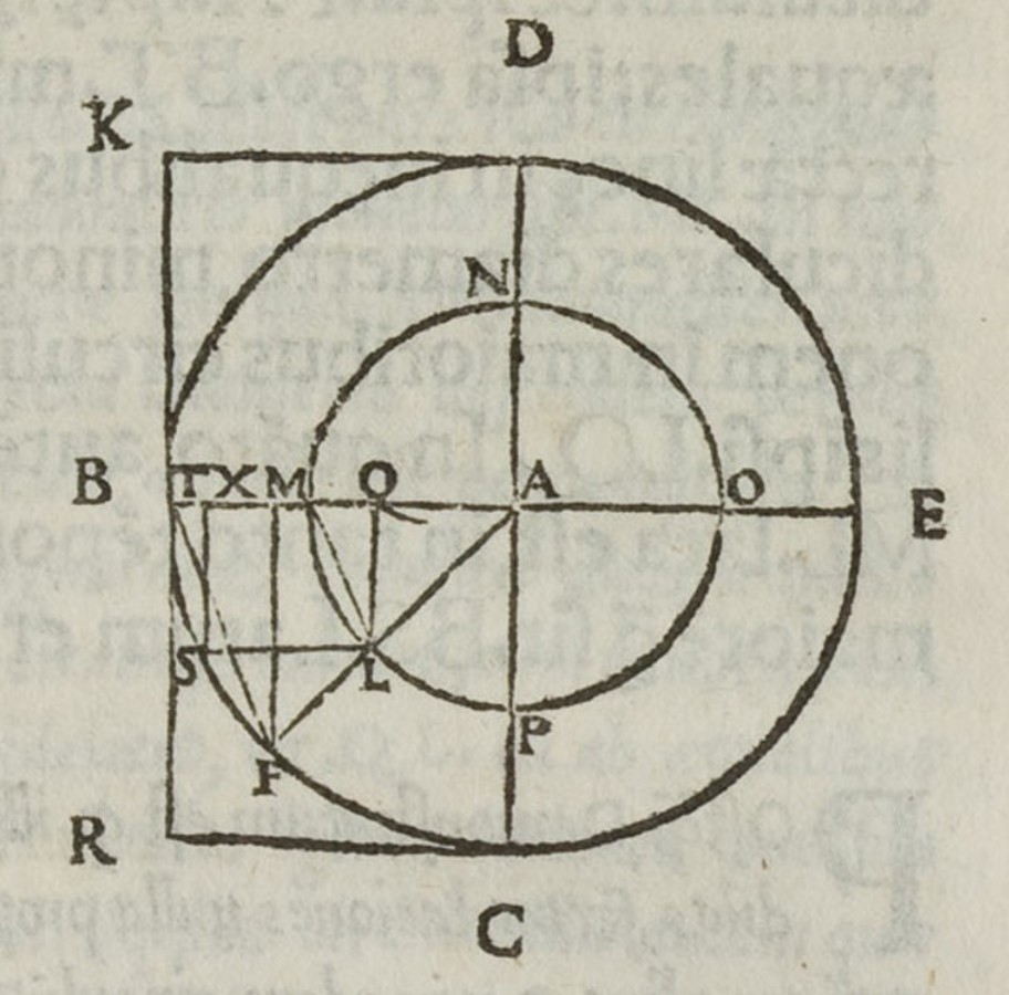 Fig. 3.1: Drawing by Tomeo in his 1525 translation Aristotelis quaestiones mechanicae illustrating that the arc BS of the larger circle is less bent than the arc ML of the smaller circle. According to Aristotle, the interference of the violent constraint on the natural downward motion must thus be greater on the smaller than on the greater circle.