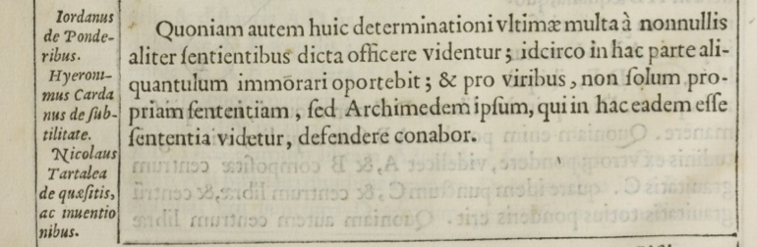 DelMonte 1577, 8v added the marginal note: Cardanus primo de subtilitate. The note concerns Cardano 1550, 16–17. Drake and Drabkin 1969, 266, footnote 20 attribute misleadingly also Guidobaldo's following references to Jordanus and Tartaglia to this proof.