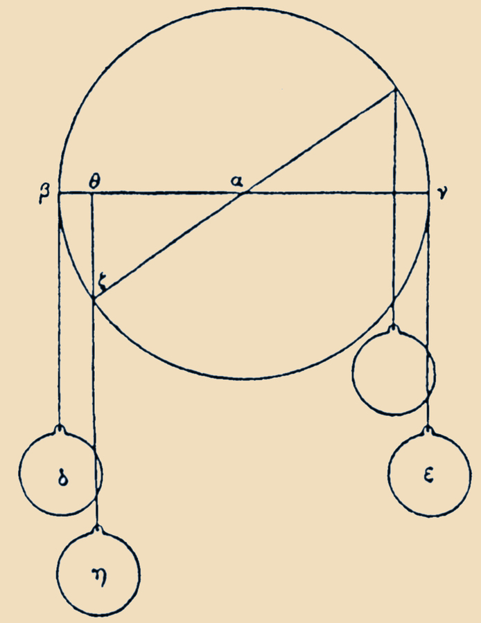 The third milestone is the work of Heron of Alexandria. Heron of Alexandria evidently knew all of the Greek sources representing mechanical ideas but used them eclectically in his reduction of mechanical devices to a classification of simple machines. In particular, Heron's Mechanics refers to parts of Archimedes' works on mechanics, some of which have been lost. Heron introduced the concept of center of gravity and applied it several times. Moreover, he used the concept implicitly when he dealt with the equilibrium of arbitrarily shaped beams of balances.35 Furthermore, in an added proposition concerning a beam in form of a pulley, he introduced a from a modern viewpoint correct solution which covered the bent lever as a special case (see figure 3.2).36