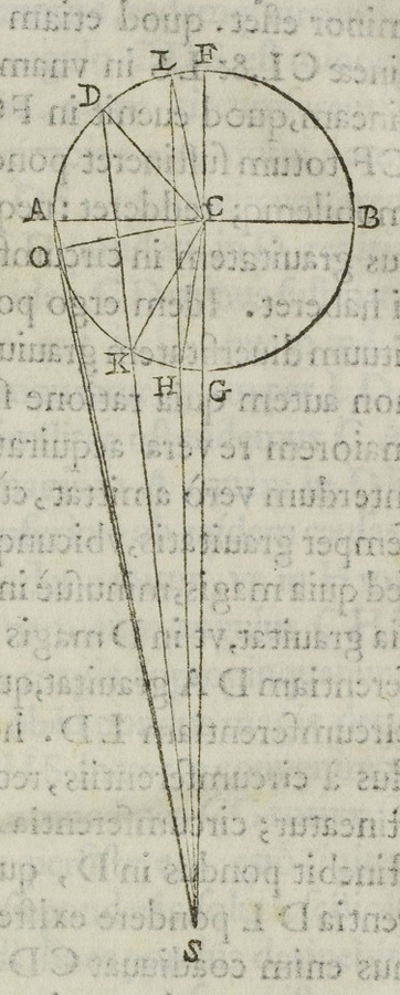 If equal arcs are taken on a greater circle, and on a smaller one, the chord of the arc of the greater circle is longer. From this I can then show that a weight on the arm of a balance becomes lighter to the extent that it descends along the semicircle. For let it descend from the upper end of the semicircle, descending continuously, I then say that since the longer arc of the circle is more contrary to a straight line, than is the shorter arc, the fall of the heavy body along the greater arc is more contrary to the fall which the heavy body would have along the straight line, than is a fall through a shorter arc. It is therefore clear that there is more violence in the movement over the longer arc, than over the shorter one; otherwise the motion would not become more contrary (in direction). Since it is apparent that in the descent (along the arc) there is more impediment acquired, it is clear that the gravity is diminished on this account. But because this comes about by reason of position of the heavy bodies, let it be called positional heaviness in what follows.56
