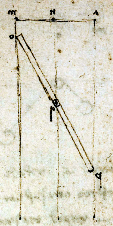 The heaviness is whole for the whole length of its carrier and whole in each part of it. Why does it happen in experience that, when the beam is along an oblique line and with its parts equally distant from the central line, it does not remain oblique, but rather makes itself horizontal and forming with the said central line 4 right angles? Answer that this comes from the imperfection of the fulcrum.50