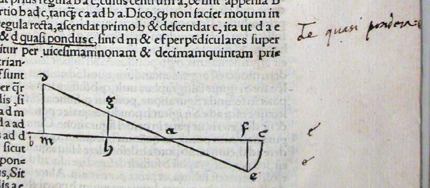 The argument compares, as usual, the obliquity of descents in order to establish which weight is positionally heavier. In the present case it is argued that the descent of the [lower] weight B is more oblique than that of [upper] weight C so that weight B is positionally lighter than weight C, with the effect that the balance returns to its horizontal position. Guidobaldo has underlined the word “ascensus” in the sentence quoted above and noted in the margin that it has to be replaced by “descensus” to make the argument work following the logic of Jordanus who compared descents on both sides of the balance: