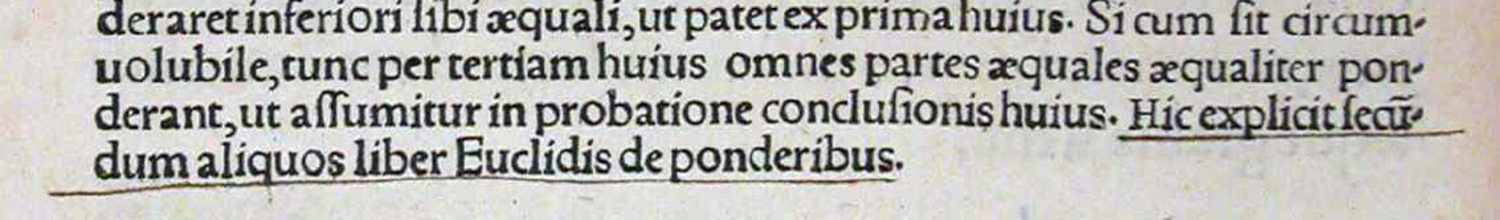 The last sentence of the commentary to the ninth theorem ascribes the first nine theorems not to Jordanus but to Euclid. Guidobaldo evidently found this remarkable and underlined the statement that here the book of Euclids ends: