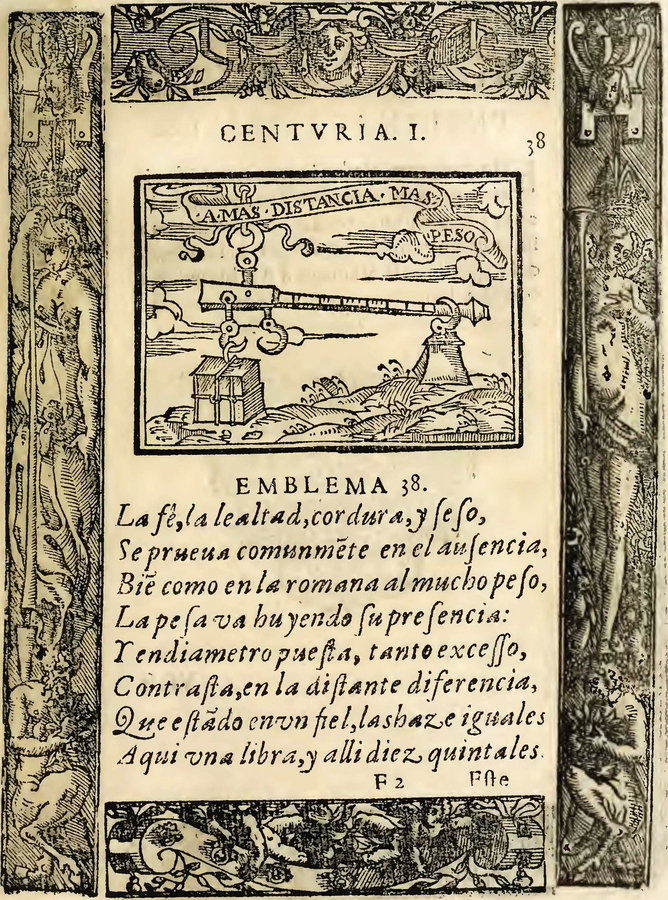 Fig. 8.1: Emblem showing a steelyard, illustrating that belief, sincerity, intelligence, and understanding are best gauged at a distance. From Covarrubias Horozco 1610.