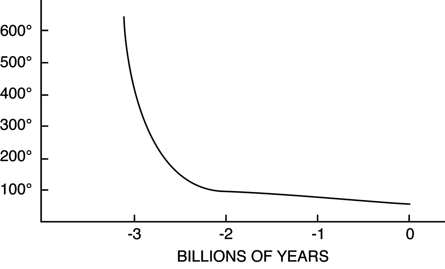 Now there is some other evidence on the question of a long period change in the gravitational interaction as we go back into the past. If gravity was stronger in the past, the sun would have been hotter, and we ask whether we can then account for the formation of rocks and creation of life. The accompanying figure (4.2) shows what we can say about the temperature of the earth.